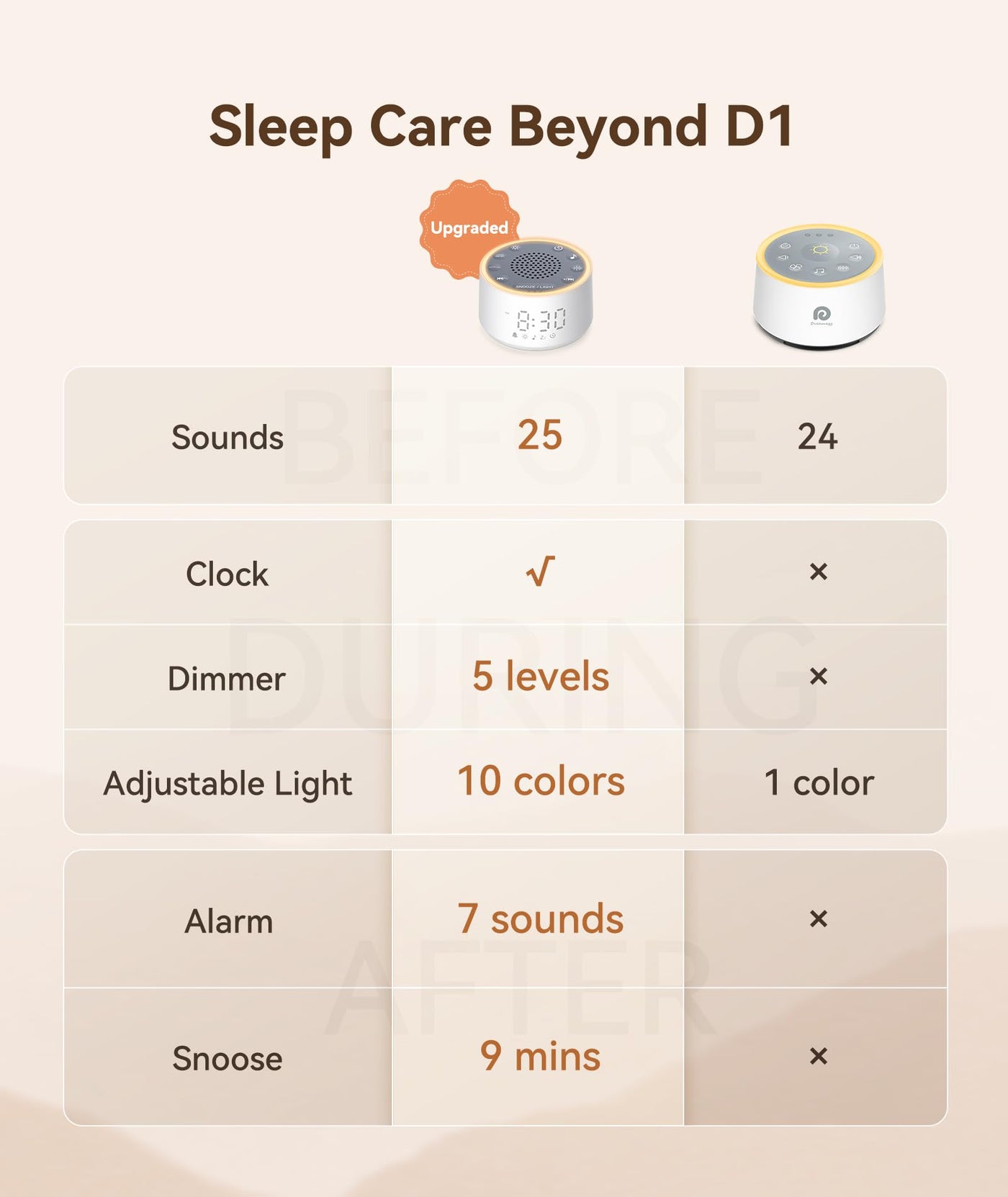Dreamegg D1 Nova: Your All-In-One Sleep Solutiontired Of Restless Nights And Jarring Mornings? Meet The Dreamegg D1 Nova Sound Machine-A Compact Travel-Ready Sanctuary (Just 0.5 Lbs!) Engineered For mature-themeds And Babies Seeking Deeper Sleep And Calmer Days.Why Choose D1 Nova?Upgraded By Your Voice: Evolved From The Beloved D1 Classic This White Noise Sound Machine Now Includes A Built-In Alarm Clock And Travel-Friendly Size-All While Preserving enhanced Sound Quality And Sleek Aesthetics.Key Features:Fall Asleep Effortlessly 25 Soothing Sounds: 6 White Noise Options 2 Fan Sounds 8 Lullabies 9 Nature Sounds-All Phone-Free. Smart Timer: Set Playtime From 10-480 Min With Auto-Off. Memory Function: Your Favorite Settings Await Nightly.Stay Asleep Undisturbed 5-Level Adjustable Dimmer: Customize Clock Brightness (0-100%) To Avoid Blinding Glare. Midnight Time Check: Glance At The Display-No Phone Grabbing-To Ease Anxiety And Drift Back Faster. 0-100% Dimmable Night Light: Soft Ambiance For Feedings Or Reading.Wake Up Refreshed 7 Gentle Nature Alarms: Birds Piano Brook Meditation And Beep 9-Min Snooze: Gradual Ascent Into Your Day.Invest In Rest. Conquer Your Day.