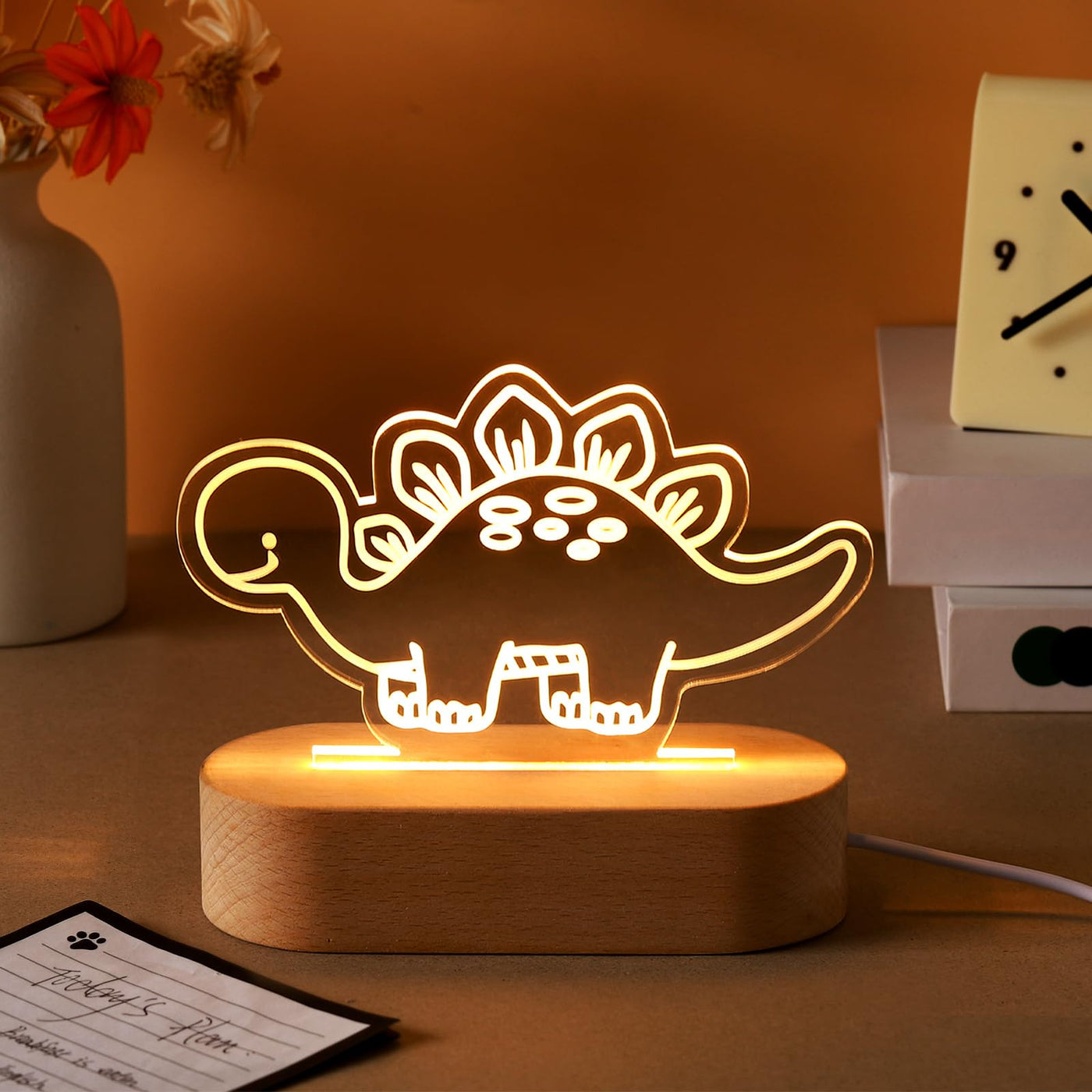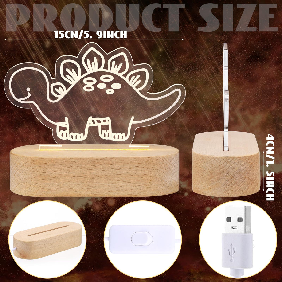 Features: The package includes 1 dinosaur night light along with a plastic base. All you need to brighten your space with a warm. The night light is straightforward to set up. Just be to remove the protective film on the acrylic surface before use for the better results. This dinosaur night light makes for an ideal gift for anyone appreciative of cute, meaningful presents. Its ideal for birthdays, anniversaries, housewarming events, or just to say you care. This gift is sure to leave a warm. Specifications: Material: acrylic with plastic base Color: acrylic with printing, warm color Size: Acrylic dinosaur: about 6.7 x 7.1 inches/ 17 x 18 cm Package includes: 1 x Dinosaur night light with base Notes: Manual measurement, please allow slight errors on size. The color may exist a slight difference due to different screen displays.
