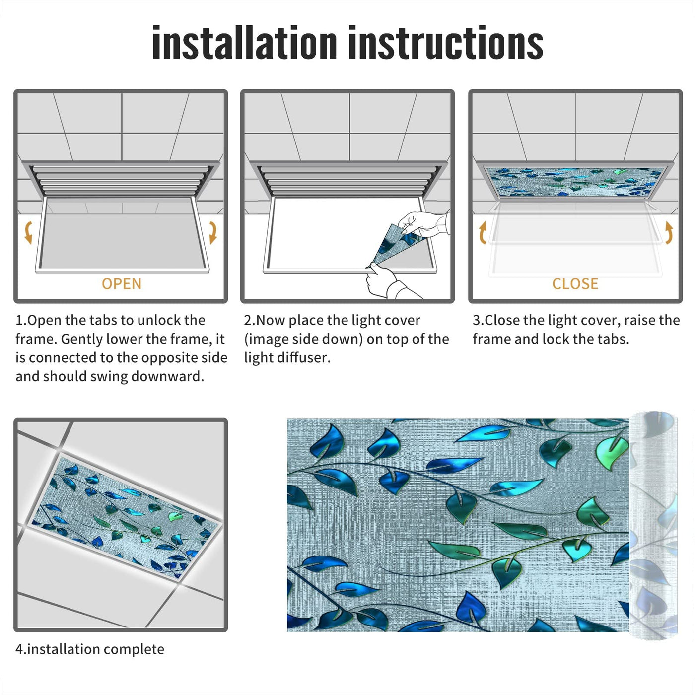 Q: How do I install the fluorescent light cover?A: Installation is easy and requires no tools. Simply open the LED light fixture board, place the light cover (image side down) on top of the hard light diffuser, and then reinstall the fixture back to the ceiling.