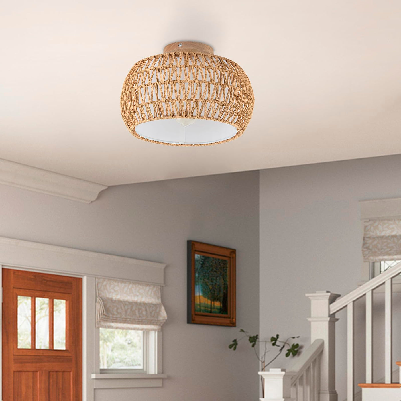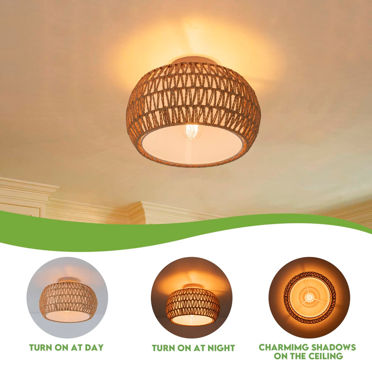 Rattan Chandelier Specification Retro Design Meets Vintage Craftsmanship In Our Boho Light Fixture Ceiling Mount,The White Fraric Drum Lampshade Reflects The Soft And Warm Light Throughout Your Room Ceiling,Rich Bohemian And Coastal Are Gathered In This Woven Light Fixture.If You Like A Boho Style, This Rattan Ceiling Light Is Perfect!! Voltage:Ac120V Power Source:Hardwired Power Max.:60W Material:Metal/Rattan/Wooden/Fabric Shade Color:Wooden/White Mount Type:Flush Mount Chandelier Light Direction:Multiple Directions Color:Brownchandelier Size: Diameter12.99 Inches* Height*6.29 Inches, Lamp Base 5.1Inches. Bulb Socket:E26 Recommended Bulb:Led/Incandescent/Halogen/Fluorescent/Dimmable Bulb Widely Use:The Beach Light Fixture Is Perfect Gift For House Warming Family Or Friends,Ideal For Foyer,Kitchen Island,Dressing Room,Hallway,Entryway,Bedroom,Dining Room,Living Room,Bathroom,Home Office.