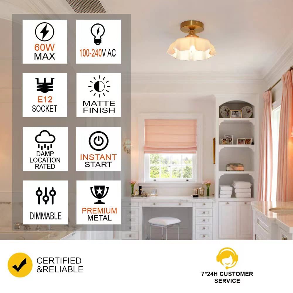 Dsmjfu Brass Semi Flush Mount Ceiling Light, Cute Small Pink Glass Shade Ceiling Light Fixtures For Closet, Hallway, Entryway