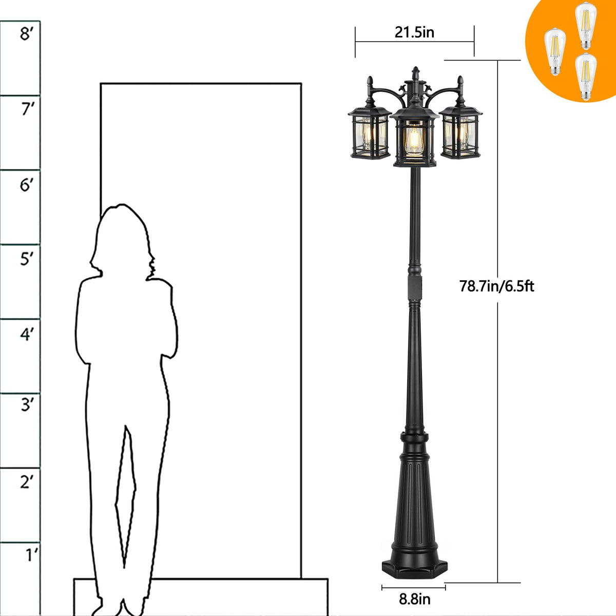 Q: What are the installation requirements for the outdoor lamp post?A: The lamp post is designed for easy installation and comes with 3 LED bulbs, mounting hardware, and assembly instructions, allowing you to set it up without hassle.