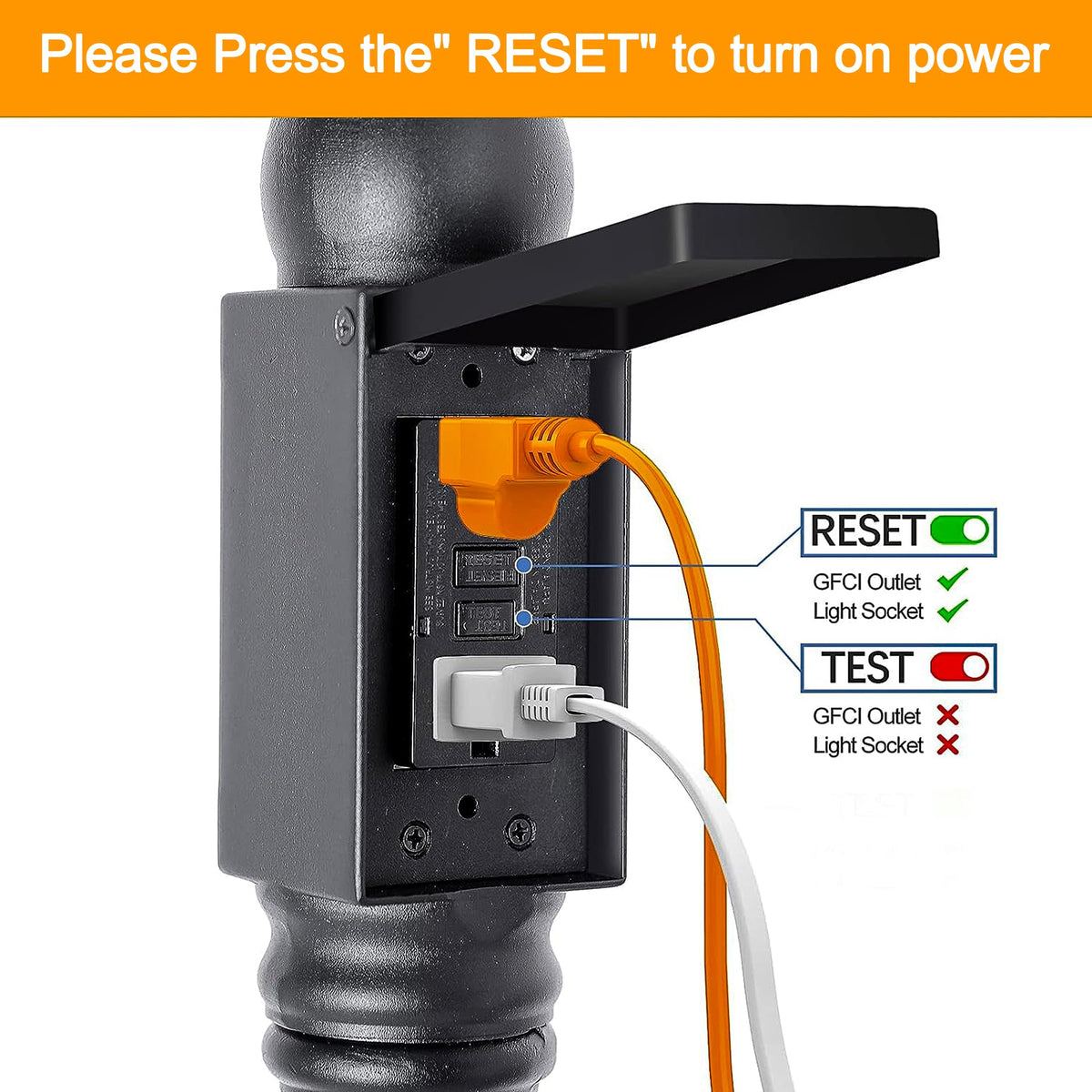 Advanced GFCI Technology: The lamp post includes a GFCI (Ground Fault Circuit Interrupter) outlet with two receptacles. This feature provides easy access to outdoor power while offering protection from power surges, short circuits, and other electrical faults, accommodating a maximum load of 1875W.