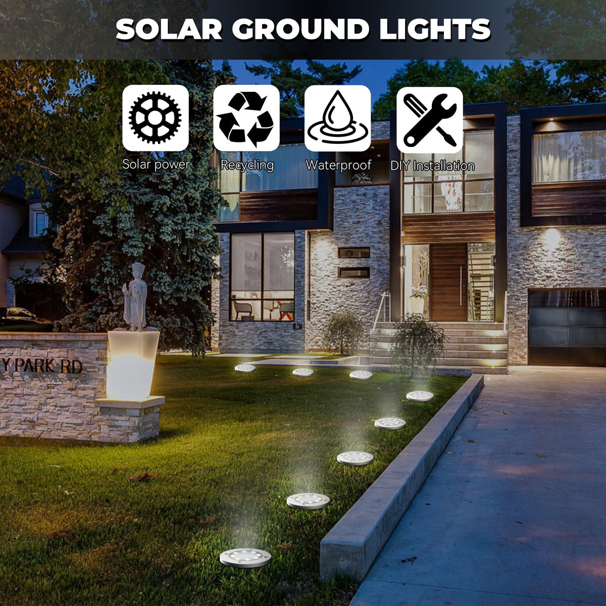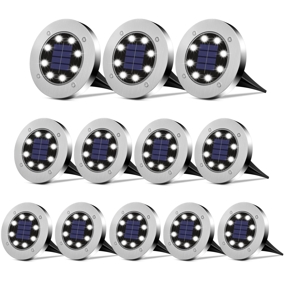 12 Pack Solar Ground Lights- Add A Touch Of Elegance To Your Outdoor Spaces With Our Waterproof Solar Outdoor Lights. With 12 Disk Lights Featuring 8 Led Bulbs Each, Our Solar Garden Lights Are Perfect For Illuminating Your Patio, Pathway, Lawn, Yard, Deck, Driveway, And Walkway.