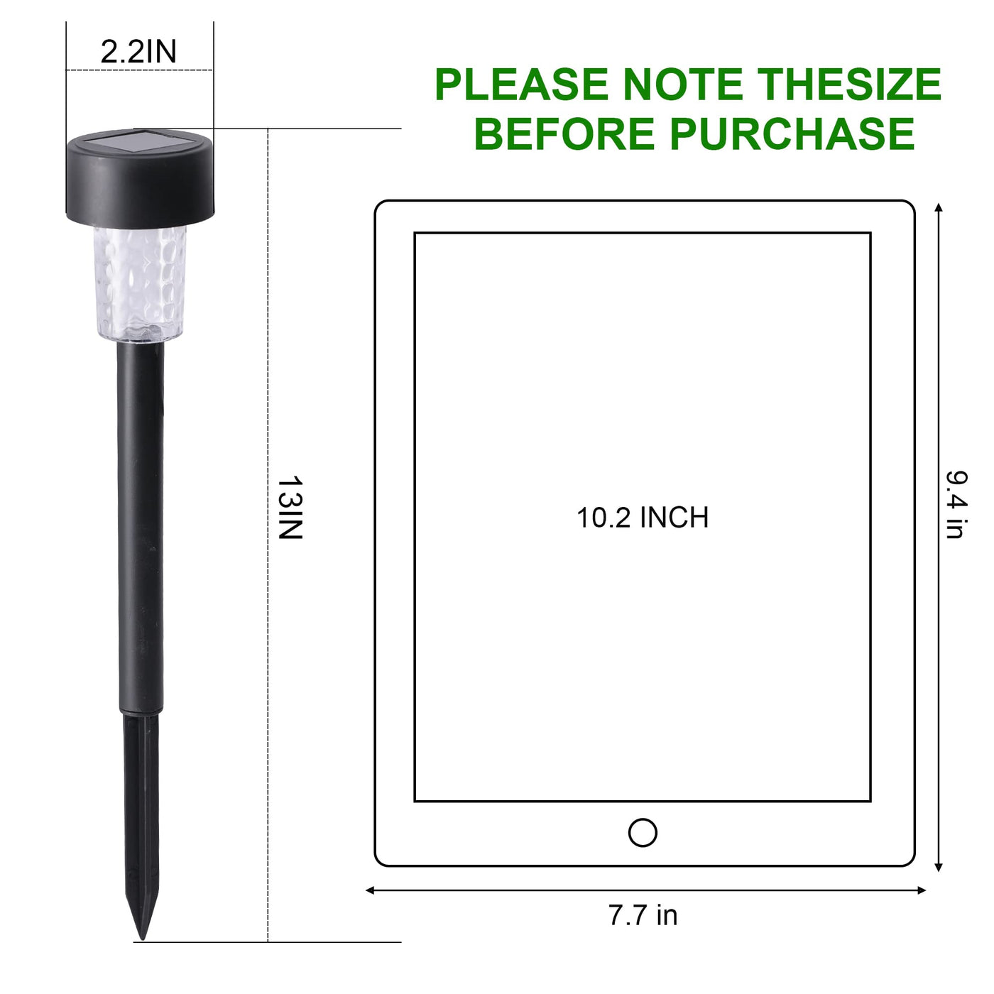 Tips: 1 . There is a switch at the back of the solar panel, please turn it ON before use, then the solar panel will get recharged during the day, and lights will auto turn on at night. 2 . If the ground is hard or dry, water it gently and let it soak in the soil for a few hours to loosen the soil. Do not twist or hammer the stake into the ground forcefully, otherwise it may result in the product damage. 3 . The charging effect of the solar panel depends on the sunlight, so the LED lighting time is affected by weather, seasons, places, etc. 4 . Please cover the solar panel if you want it light up at daylight. 5 . Fully charged the solar panel under sunlight for 10 hours at the first time use. 6. Make sure there is no strong light source around the solar panel at night. Warning: Do not use damaged rechargeable batteries. Do not mix old and new batteries.