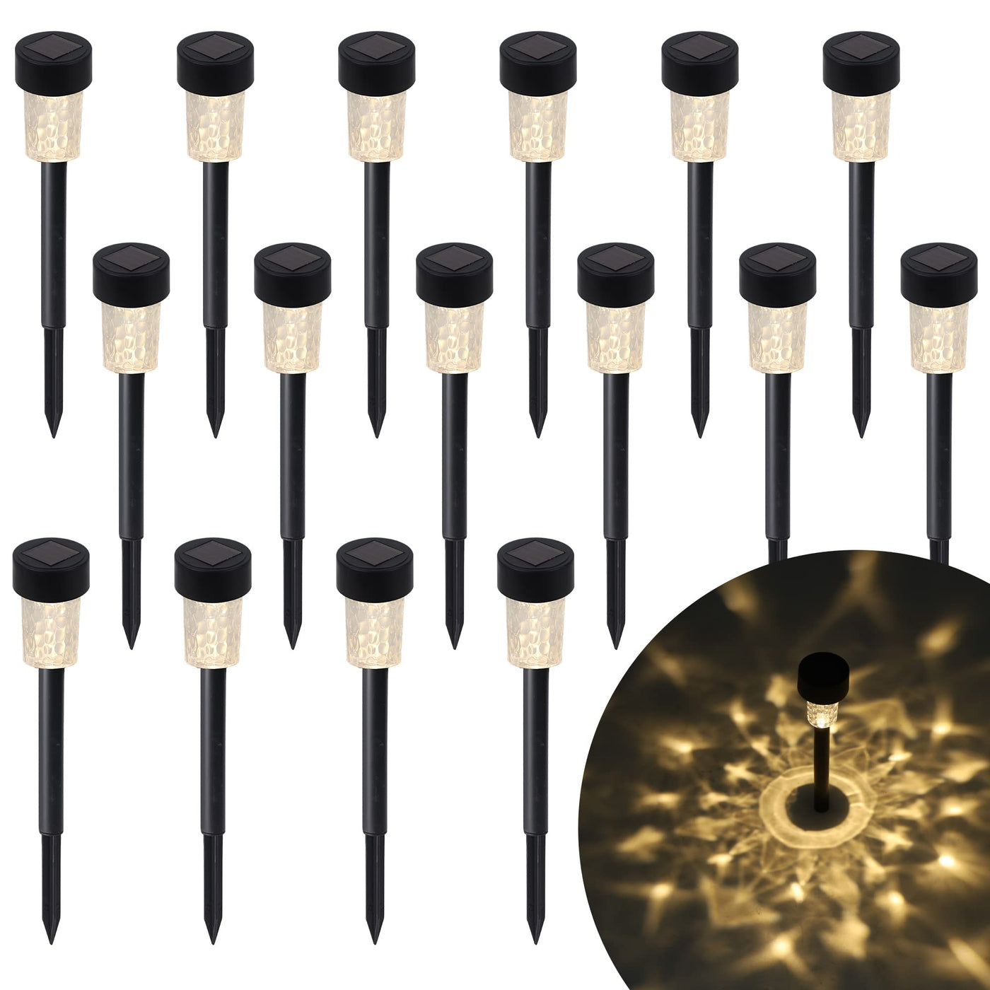 Dynaming 16 Pack Solar Pathway Lights Outdoor, Solar Powered Auto On/Off Garden Colorful Decorative Lights Our 16 pack warm white pathway lights powered by solar are the perfect decorative outdoor lighting with no electricity required. They will automatically turn on at dusk and off at dawn, saves energy. The outdoor solar lights are made of high quality thick PLASTIC. IP44 Waterproof solar panel is suitable for outdoor use, no worries about little rain, snow, frost, or sleet.