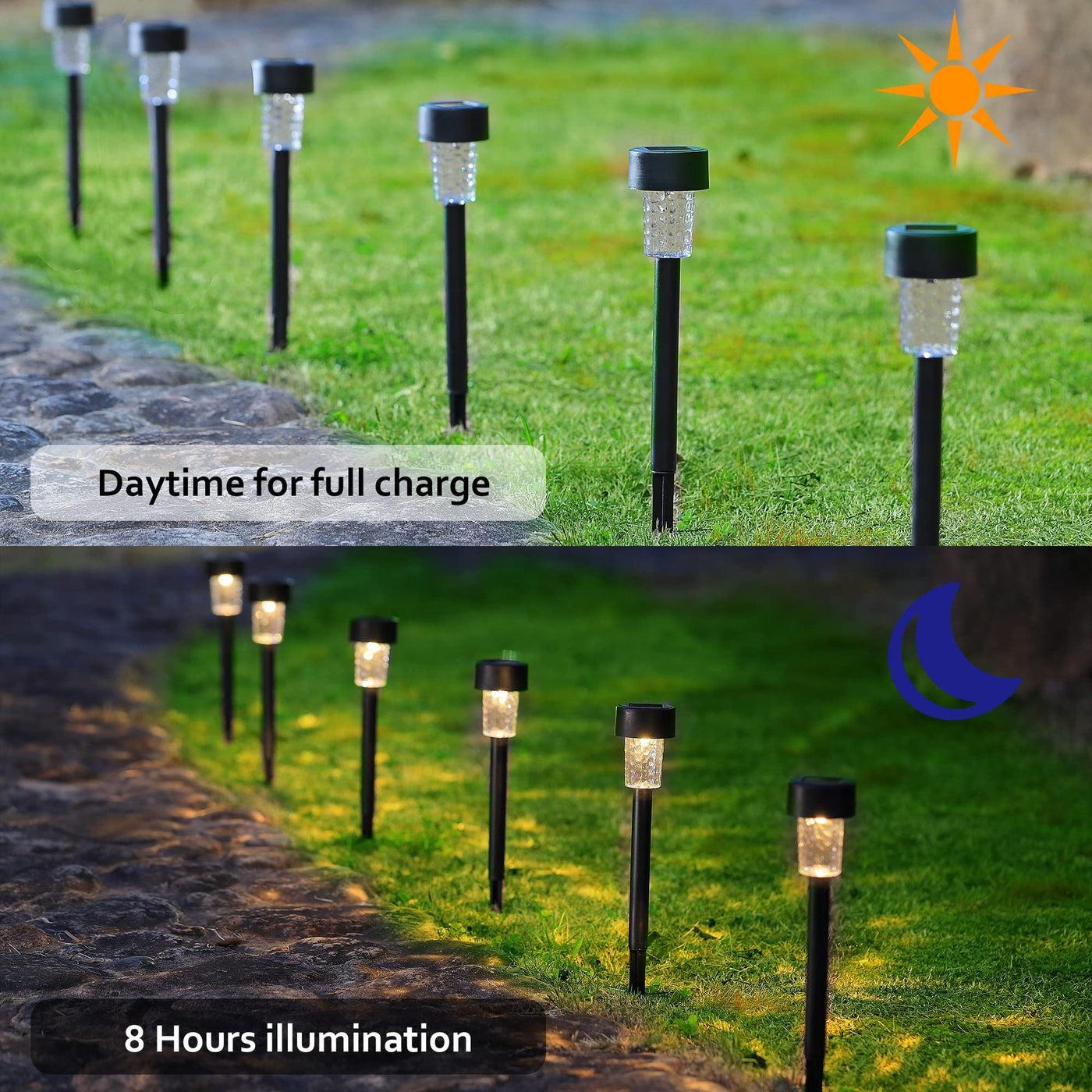 Q: What is the charging time for these solar pathway lights?A: The solar pathway lights require about 6-8 hours of direct sunlight for a full charge. It's important to turn the ON/OFF switch located at the back of the solar panel to 'ON' before charging.