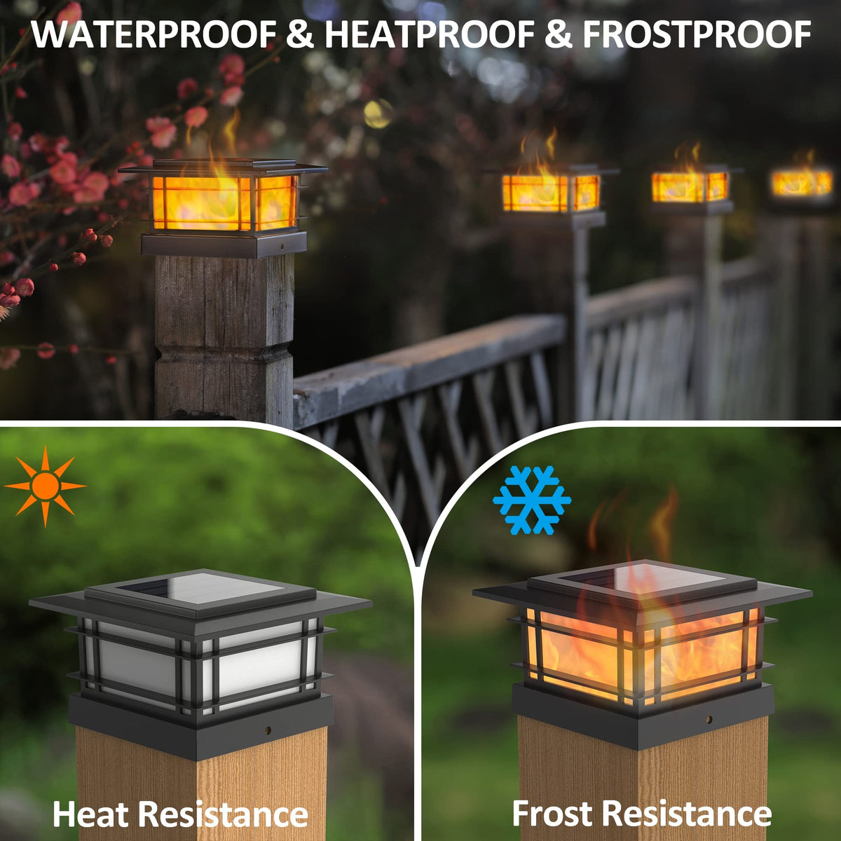 Dynaming 4 Pack Solar Flame Post Lights Outdoor, Solar Powered Fence Post Cap Lights, High Brightness Flickering Flame Smd Led Lighting Decor For Garden Deck Patio, Fit 4X4, 5X5 Or 6X6 Wooden Posts