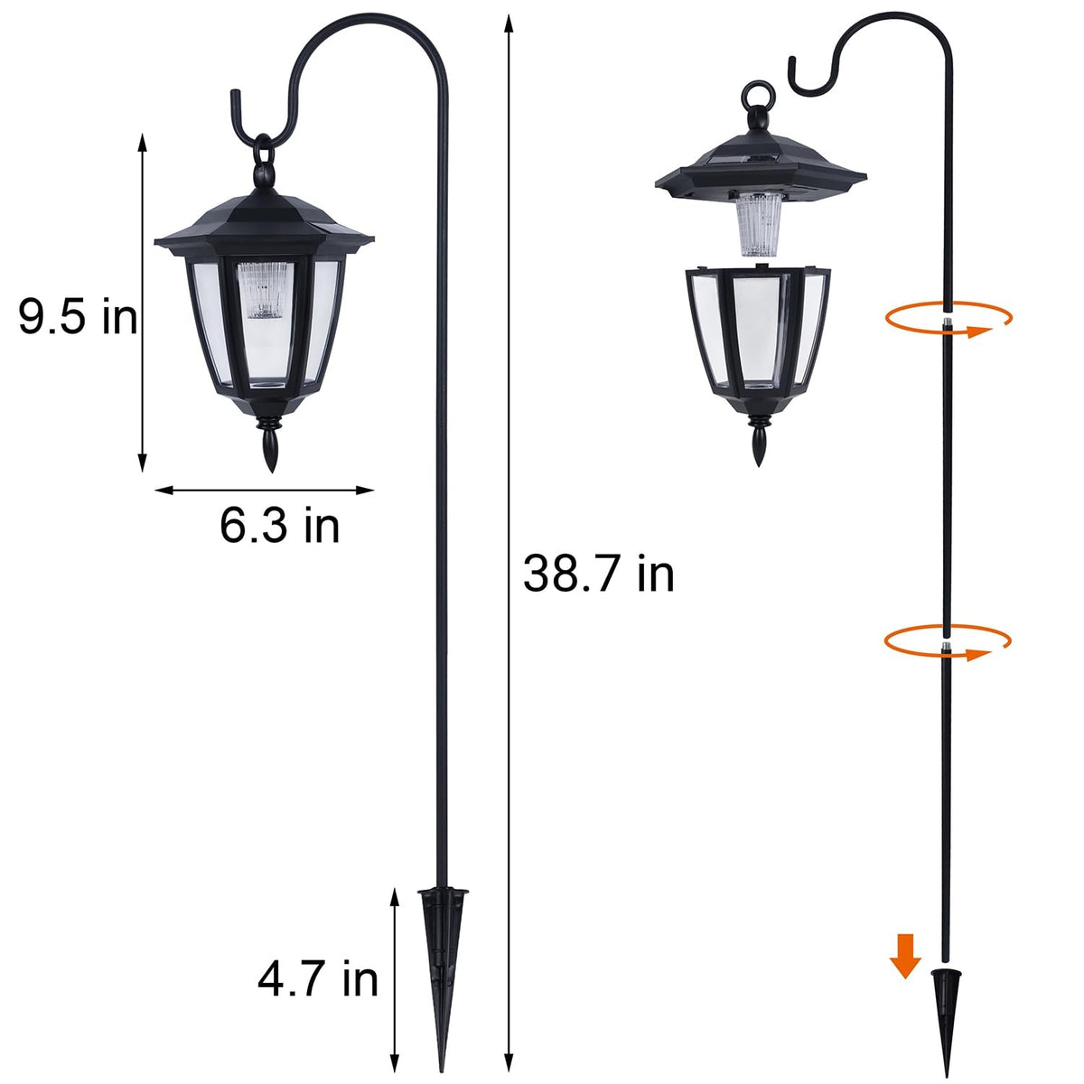 Q: How easy is it to assemble the solar lights?A: The solar hanging lights come with detailed instructions and can be assembled in just a few minutes. Simply screw the shepherd hooks together and stake them into the ground in direct sunlight.