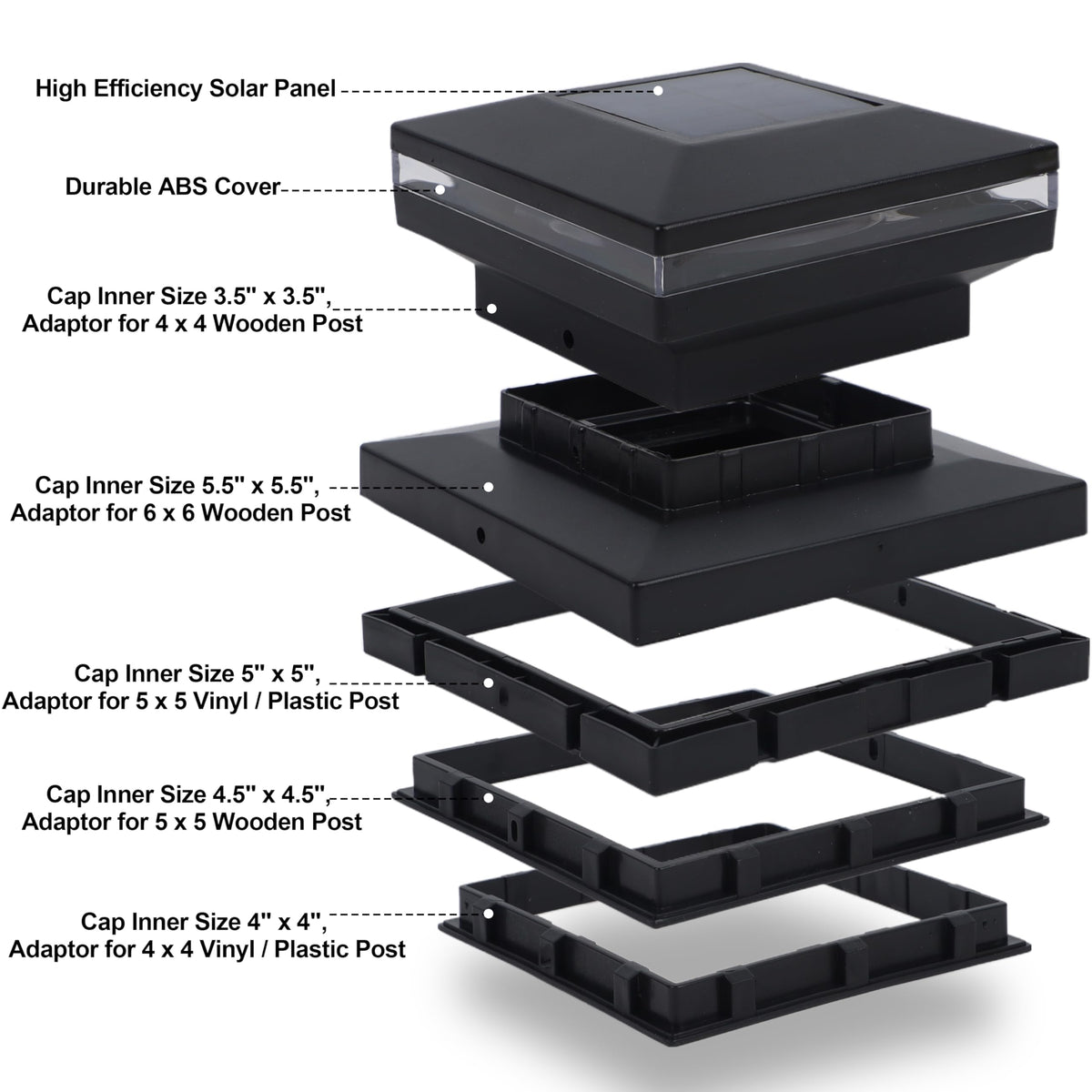 Q: How do I install the Dynaming Solar Post Lights?A: The installation of the Dynaming Solar Post Lights is straightforward. Each pack includes detailed instructions. You have two different sized caps that fit 4x4 and 6x6 square wooden posts. For a 5x5 wooden post, simply add screws to the two holes in the larger cap to secure it. Ensure the tab on the back of the solar panel is removed before charging to allow it to operate automatically at night.