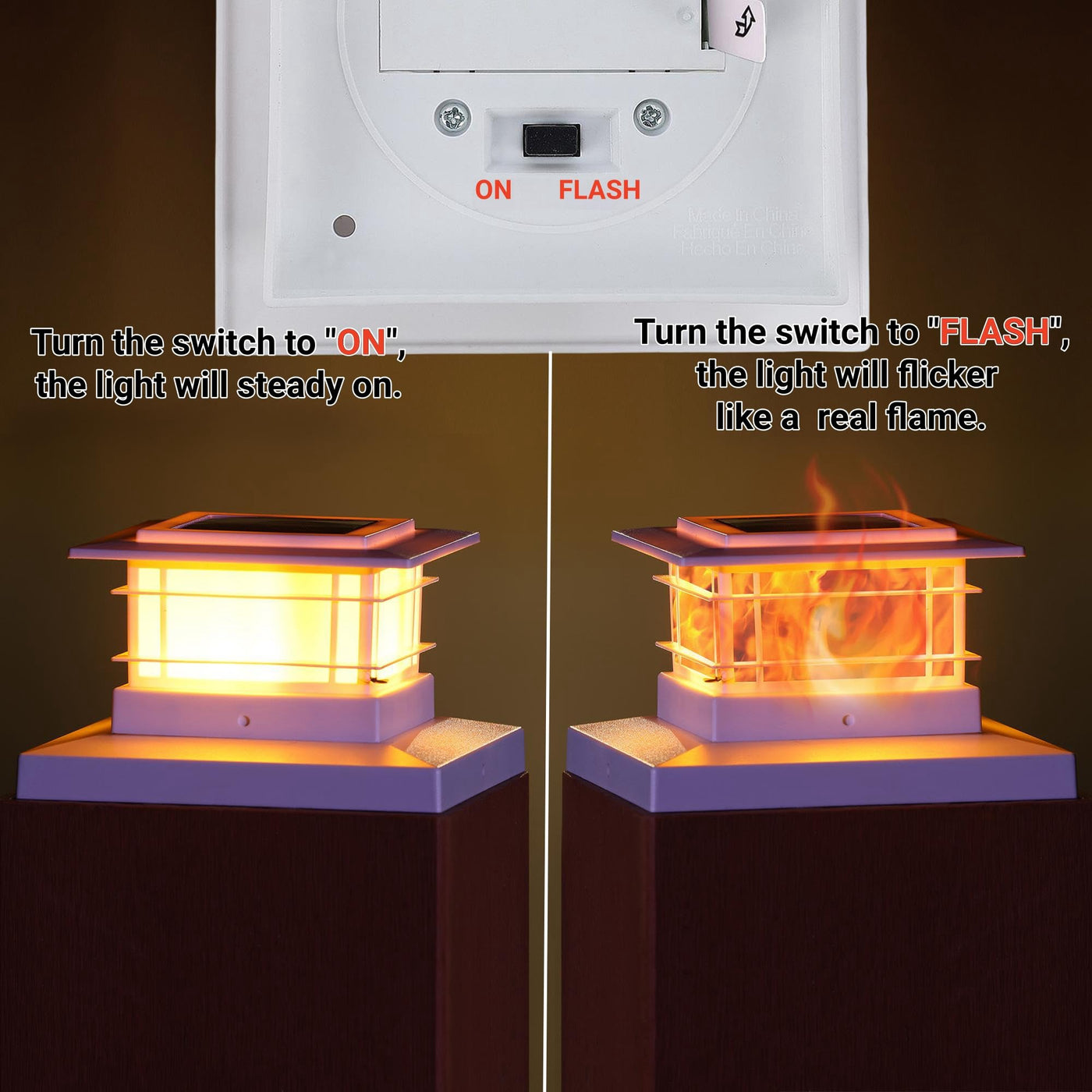 Dynaming 6 Pack White Shell Solar Flame Post Lights Outdoor, Solar Powered Fence Post Cap Lights These solar flame post lights is NOT electricity needed. When fully charged, the light lasts for 8 hours. The solar panel supports long-term operations. A safe alternative to the real flame effect- 72 pcs high brightness SMD LEDs, when night comes, it lights up and the LED flame light leaping, which will bring you a beautiful scenery. Add a 360 degree viewing angle illuminate charming to your garden, decorate your fence, deck, porch or yard. Very easy to install and provide a calming atmosphere at night. Our solar light post caps can be placed in the front, backyard, along driveway, walkway, sidewalk, around your patio or porch, adds a modern look for your outdoor lighting.