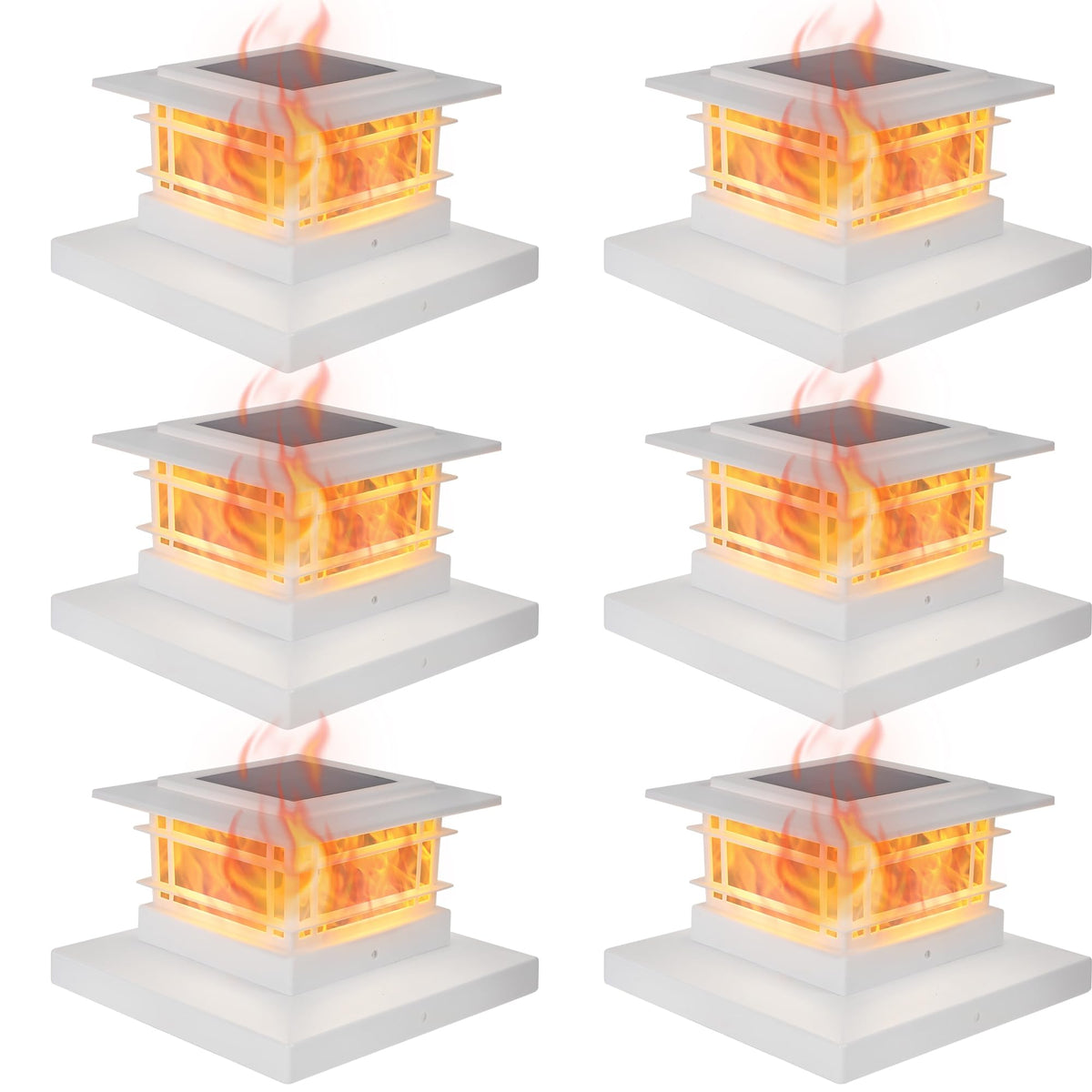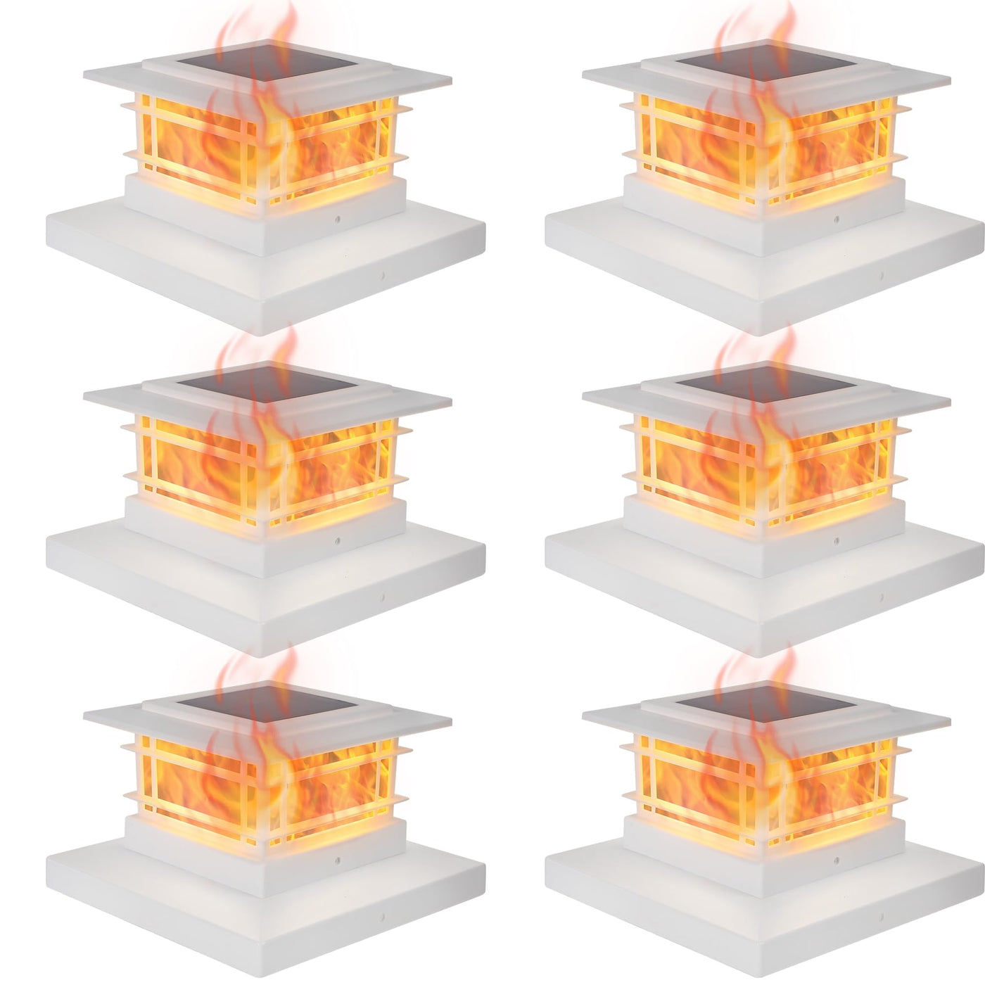 Dynaming 6 Pack Solar Flame Post Lights Outdoor, Solar Powered Fence Post White Shell Cap Light, High Brightness Flickering Flame Led Livinyl/Wooden Postseck Patio, Fit 4X4 5X5 6X6 Vinyl/Wooden Posts