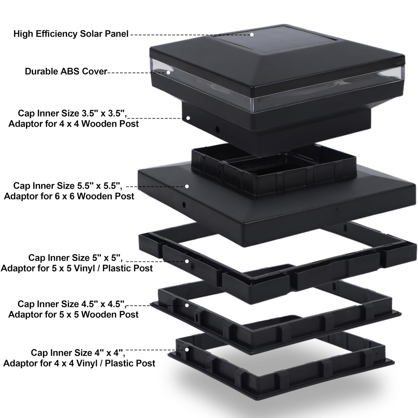 Q: Are these solar post lights compatible with all types of wooden posts?A: These solar post lights come with two different sized caps (3.5”x3.5” and 5.5”x5.5”) to fit 4x4 and 6x6 square wooden posts. For 5x5 posts, you can use screws to secure the larger cap, but they may not fit all vinyl post sizes.