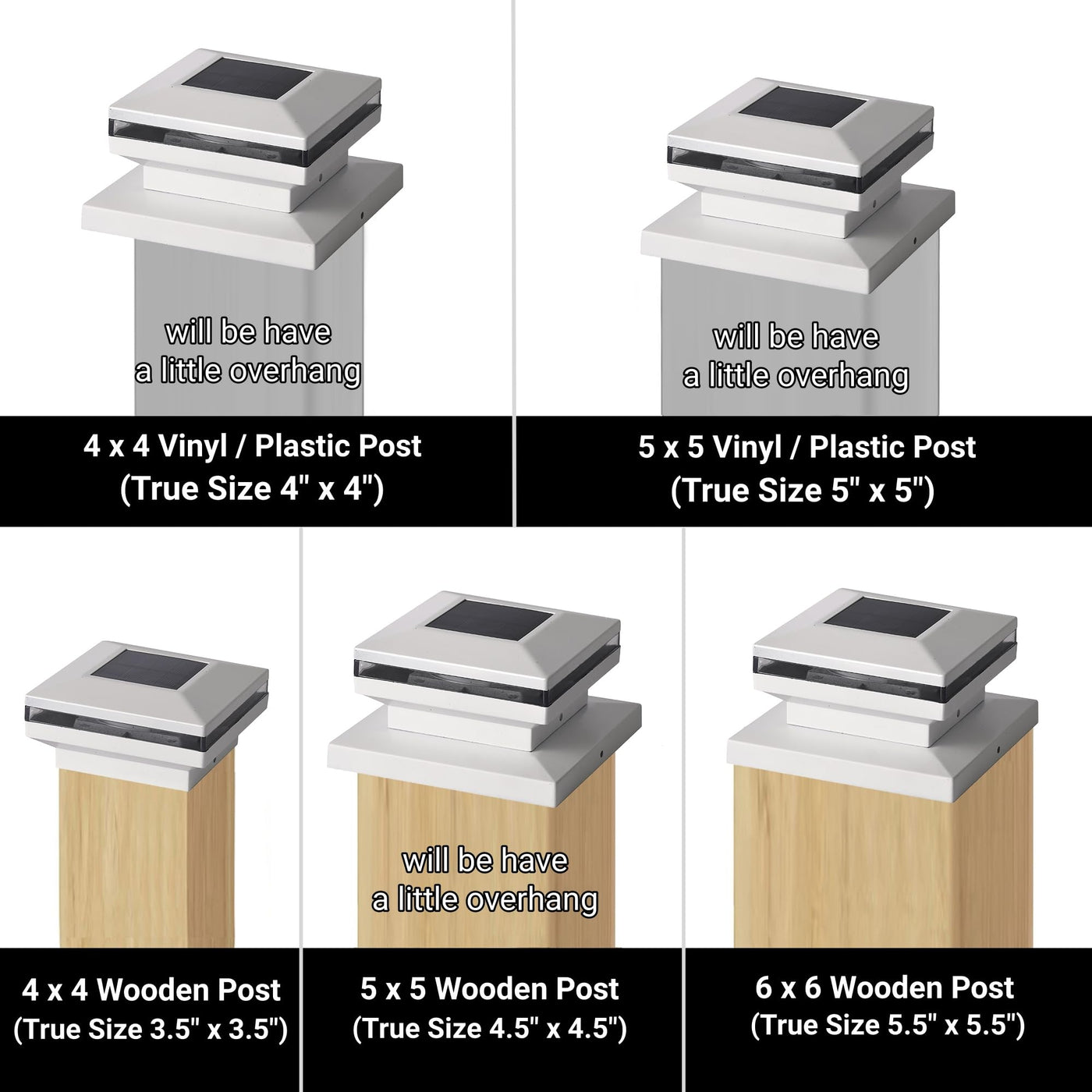 Q: What size wooden posts are compatible with these solar post lights?A: These solar post lights are designed to fit 4x4, 5x5, or 6x6 wooden posts, making them versatile for various installations.