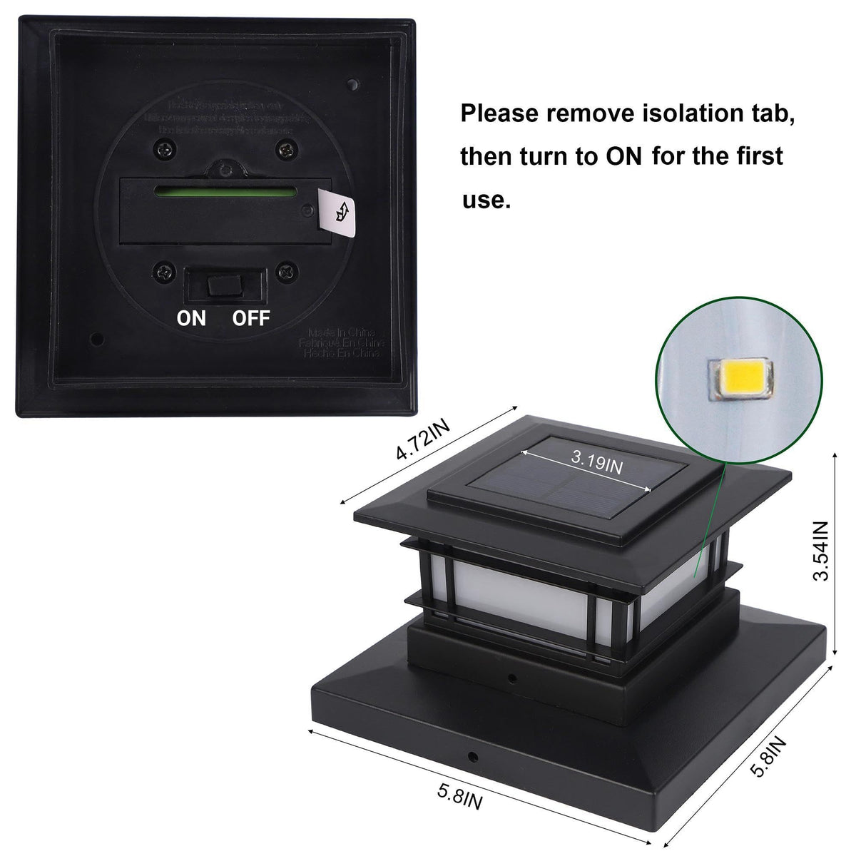 Q: How do I install the solar post lights?A: Installation is straightforward; simply remove the tab on the back of the solar panel before charging it under sunlight. The package includes various sized caps to accommodate different post sizes for easy assembly.