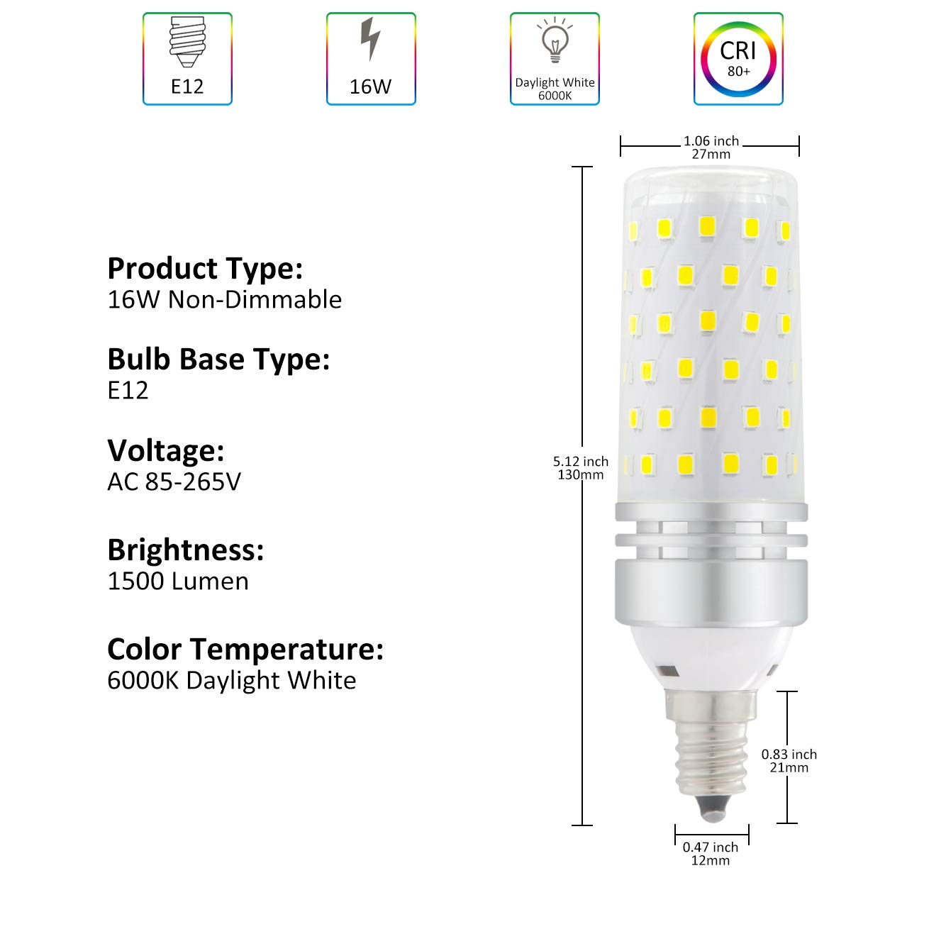 Specification: Wattage: 16W Dimmable: NO Color: Warm White 3000K Luminous Flux: 1500LM Beam Angle: 360 degrees Color Rendering Index(CRI):> 80+ Input Voltage: AC 85-265V Material: Aluminum+PC Life Span: 30,000 hours Incandescent Equivalent: 120W Eco-Friendly: No harmful lead or mercury Precaucion:1.Please be sure cut off the electricity for your safety, before your installing the lamps.2.Please be sure use the lamp in suggested voltage range, in avoid of any damage to the lamp or your electronic devices.3.Please be sure use the lamp in operating temperature -4?~104?, do not apply the lamp in any small sealed environment without air cooling.4.Do not expose the lamp in liquid.5.Do not apply to those electronic devices that run with dimmer switch or remote control. What is in the box: 4 x 16W E12 LED Bulbs 1 x service card Warm Tips:If there is anyquality issue, or you are not satisfied with our product, please contact us by email.