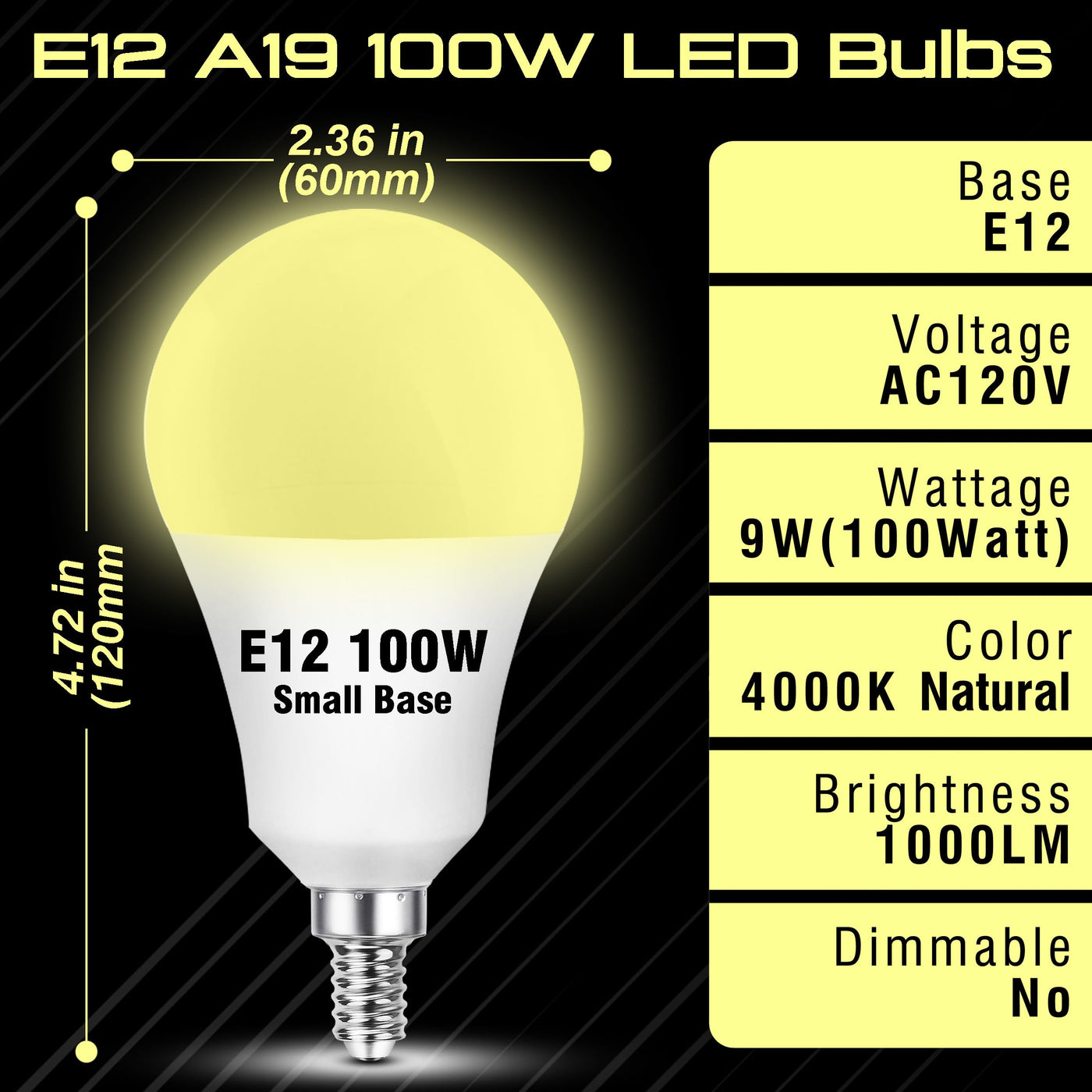 E12 Candelabra Led Light Bulb 100 Watt Equivalent 4000K Natural White 9W 1000Lm E12 A19 Small Screw Base A60 Globe Shape For Wall Sconces Lighting &Nbsp; About A60 Globe Shape E12 Led Bulbs: This 9W A60 Globe Lamp Body Is Paired With A Vintage E12 Candelabra Led Bulb 2700K Warm White Light/4000K Naturallight/6000K White Daylight Emitting 1000Lm High Brightness Light Super Bright And Perfect For Low Light Areas. E12 Led Bulb 100W No Flicker No Strobe No Radiation No Mercury Perfectly Balances Form And Function Enhancing The Beauty Of Any Room Or Space. Multiple Scenes: Led E12 Light Bulb Suitable For Kitchen Living Room Dining Room Bedroom Bathroom Dressing Room Dressing Room Corridor Porch Stairs Entrance Garage Courtyard Garden Supermarket School Hotel Club Show Room Shopping Mall Office Decorative Lighting Etc. Wide Used: E12 Led Candelabra Bulbs Fix For Pendant Light Ceiling Fan Light Ceiling Light Bathroom Lamp Wall Lamp Table Lamp Desk Lamp Salt Lamp Window Lamp Floor Lamp Spherical Lamp Chandelier Dressing Table Light Turkish/Moroccan Light Porch Light Terrace Light Recessed Light Satellite Light Island Light Hallway Light Range Hood Light Etc. &Nbsp; Advantage: High Brightness: We Launch This Higher Power 9W 1000Lm E12 Ceiling Fan Light Bulbs Small Base A19/A60 Led Bulb Which Can Provide Brighter Lighting For Ceilingfan Lights Chandeliers Creating A Comfortable Cozy And Relaxing Atmosphere. Eye Protection: E12 Light Bulbs Bright White Have No Flicker No Buzzing And No Radiation Bringing A More Comfortable And Natural Light Providing A Comfortable And Relaxing Light For You And Your Family S Eyes. Save Money: 9W Led Corn Light Bulb Adopts well-made Led Chips With Excellent Heat Dissipation Performance Low Heat Generation When Working Brighter Light Caneasily Replace 100W Incandescent Lamps Saving Your Electricity Bills. &Nbsp; E12 Led Ceiling Fan Light Bulbs 100Watt Equivalent E12 A19 Candelabra Base Led Bulb Natural White 4000K A60 Globe Small Base For Table Floor Lamps &Nbsp; E12 100W Led Light Bulbs Color: 4000K Natural White Luminous Flux: 1000Lm Size: 2.36* 4.68 Inches Power: 9W Workingvoltage: Ac120V Beamangle: 230?/P> Lifespan: 25 000 Hours Material: Plastic Type: Non-Dimmable 1 Package Contain: 2Pcs 9W E12 Natural White Led Light Bulbs &Nbsp; Note: Please Pay Attention To The Base Is E12 Candelabra Base Not E11 E17 E26 E27!! Please Disconnect The Power Supply Before Installing The Led Bulb Because These Bulbs Are High-Voltage Bulbs! After Turning On The Led Bulb Do Not Touch The Bulb Directly. This Is A Non-Dimmable 100W E12 Led Candelabra Lights Bulb Do Not Use With A Dimmer Switch. Please Away From Any Source Of Heat Orwater.