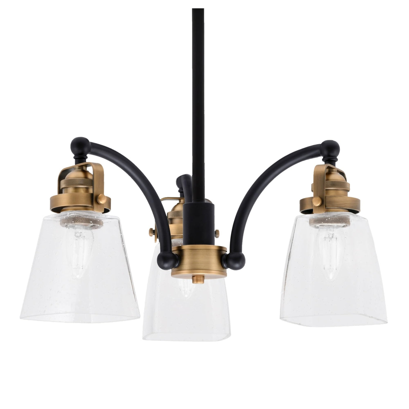 Easton Downlight, 3 Light, Chandelier Shown In Matte Black & Brass Finish With 4.5" Square Clear Bubble Glass. Min Hanging Height: 9.75. Medium Base LED bulb(s) can be used.