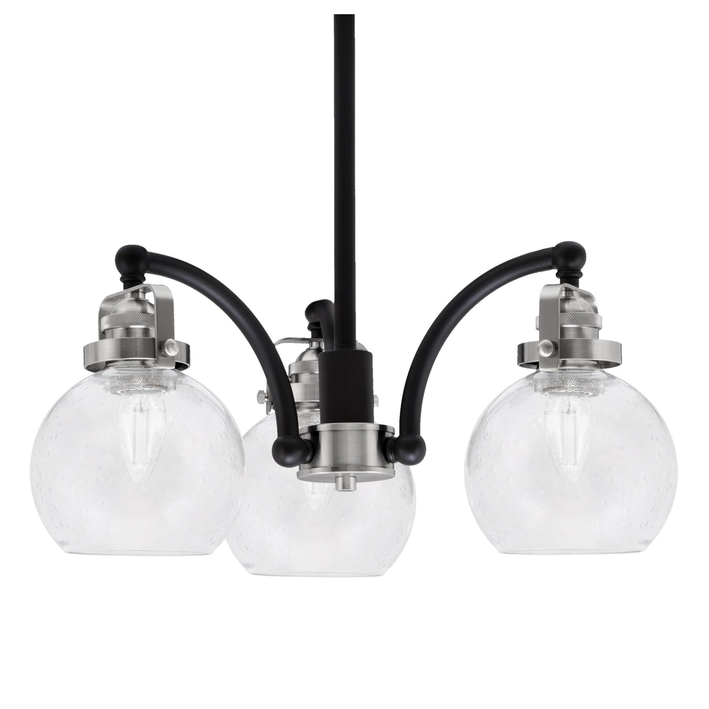 Easton Downlight, 3-Light Chandelier, shown in Matte Black and Brushed Nickel finish with 5.75" Clear Bubble Glass. Minimum hanging height: 9.75". Medium base LED bulbs may be used.