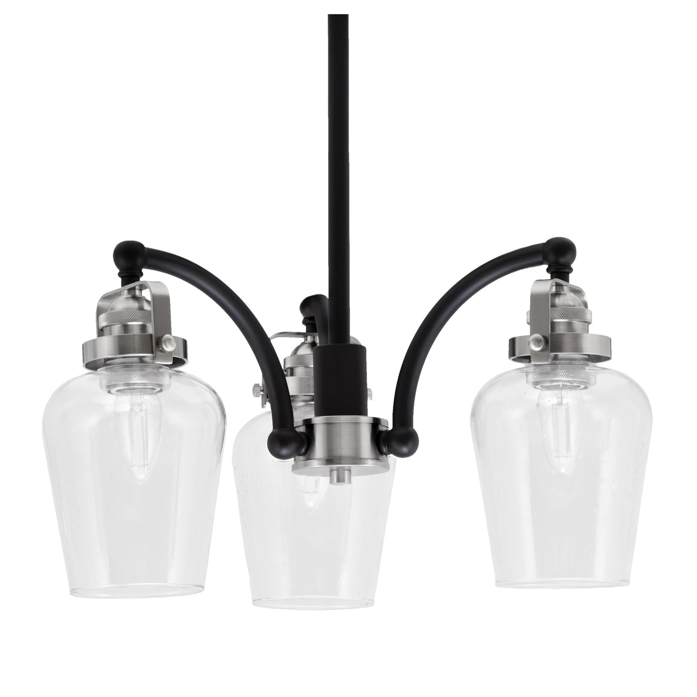 Easton Downlight, 3-Light Chandelier, shown in Matte Black and Brushed Nickel finish with 5-inch clear glass. Minimum hanging height: 10.75. Medium base LED bulbs may be used.