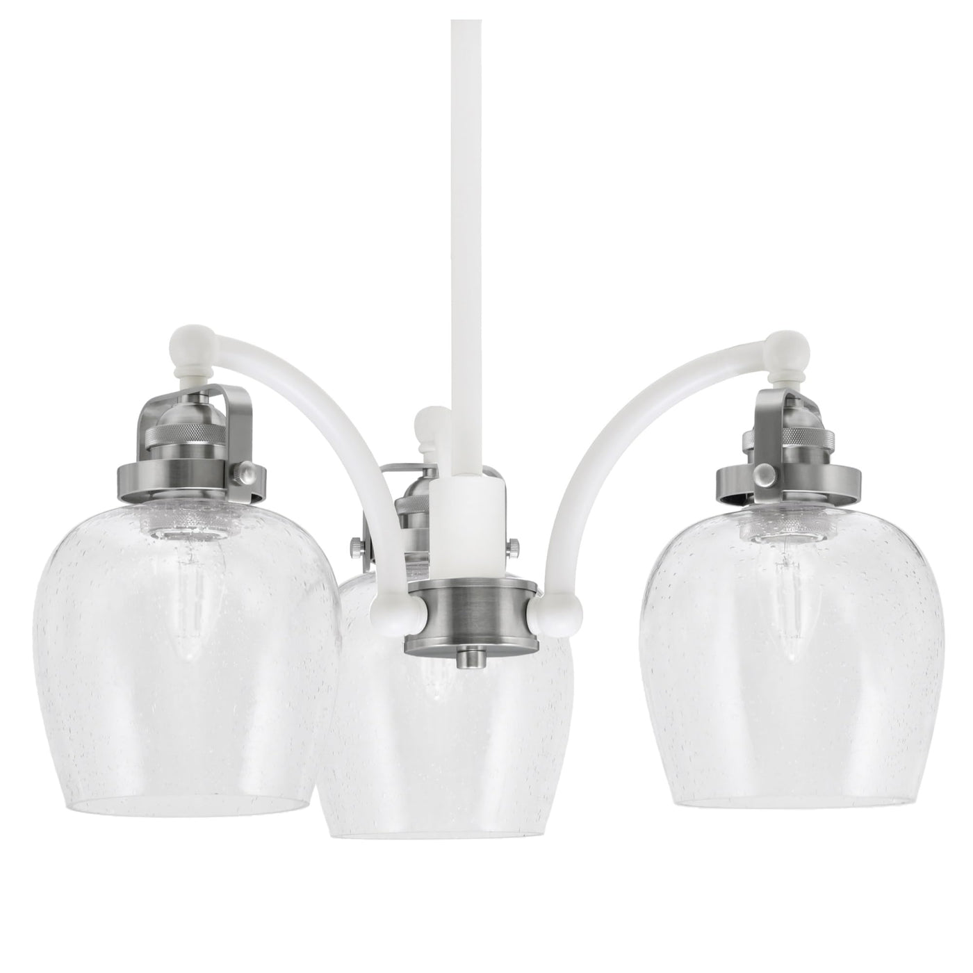 Easton Downlight, 3-Light Chandelier, shown in White and Brushed Nickel finish with 6-inch Clear Bubble Glass. Minimum hanging height: 10.5. Medium base LED bulbs may be used.