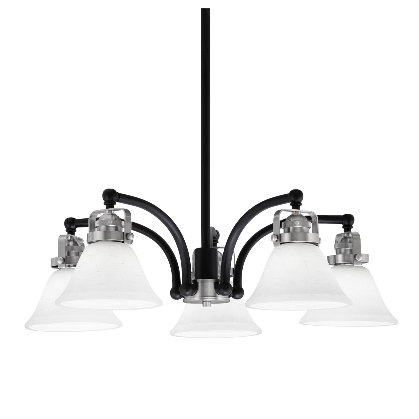 Easton Downlight, 5 Light, Chandelier Shown In Matte Black & Brushed Nickel Finish With 7" White Muslin Glass. Min Hanging Height: 8.75. Medium Base LED bulb(s) can be used.