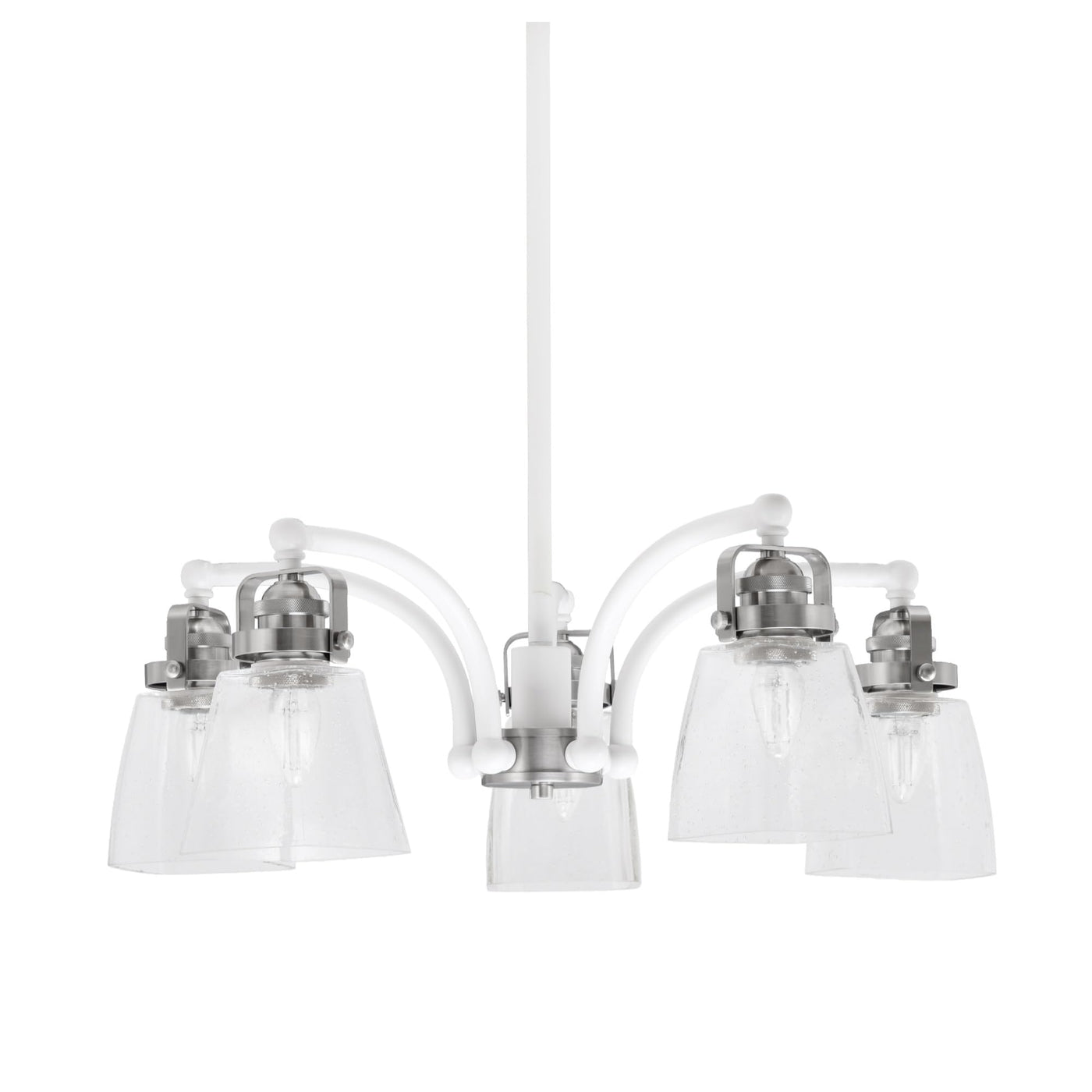 Easton Downlight, 5 Light, Chandelier Shown In White & Brushed Nickel Finish With 4.5" Square Clear Bubble Glass. Min Hanging Height: 9.75. Medium Base LED bulb(s) can be used.
