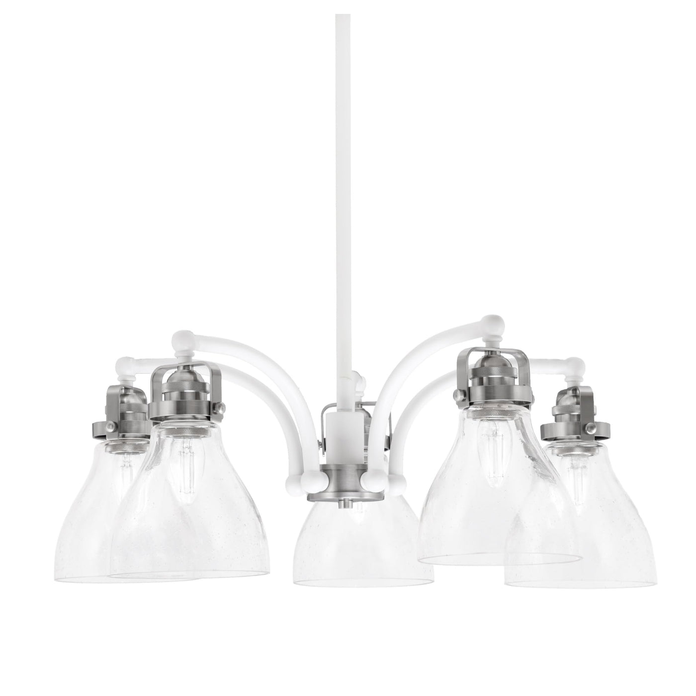 Easton Downlight, 5 Light, Chandelier Shown In White & Brushed Nickel Finish With 6.25" Clear Bubble Glass. Min Hanging Height: 10.5. Medium Base LED bulb(s) can be used.