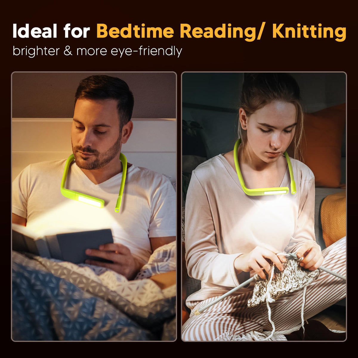 Q: What are the color temperature options available for the neck reading light?A: This neck reading light offers three color temperature options: warm for a cozy atmosphere, cool white for bright and focused reading, and warm white for a balanced, natural light that is easy on the eyes.