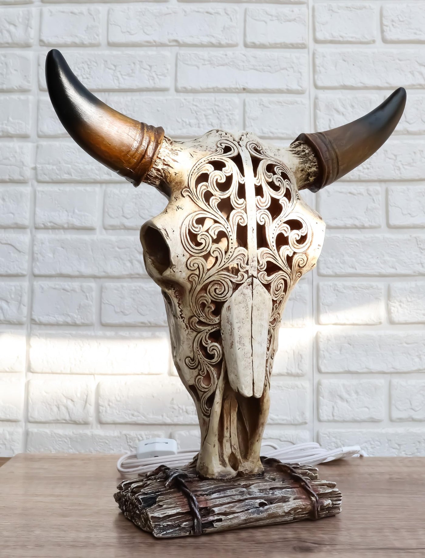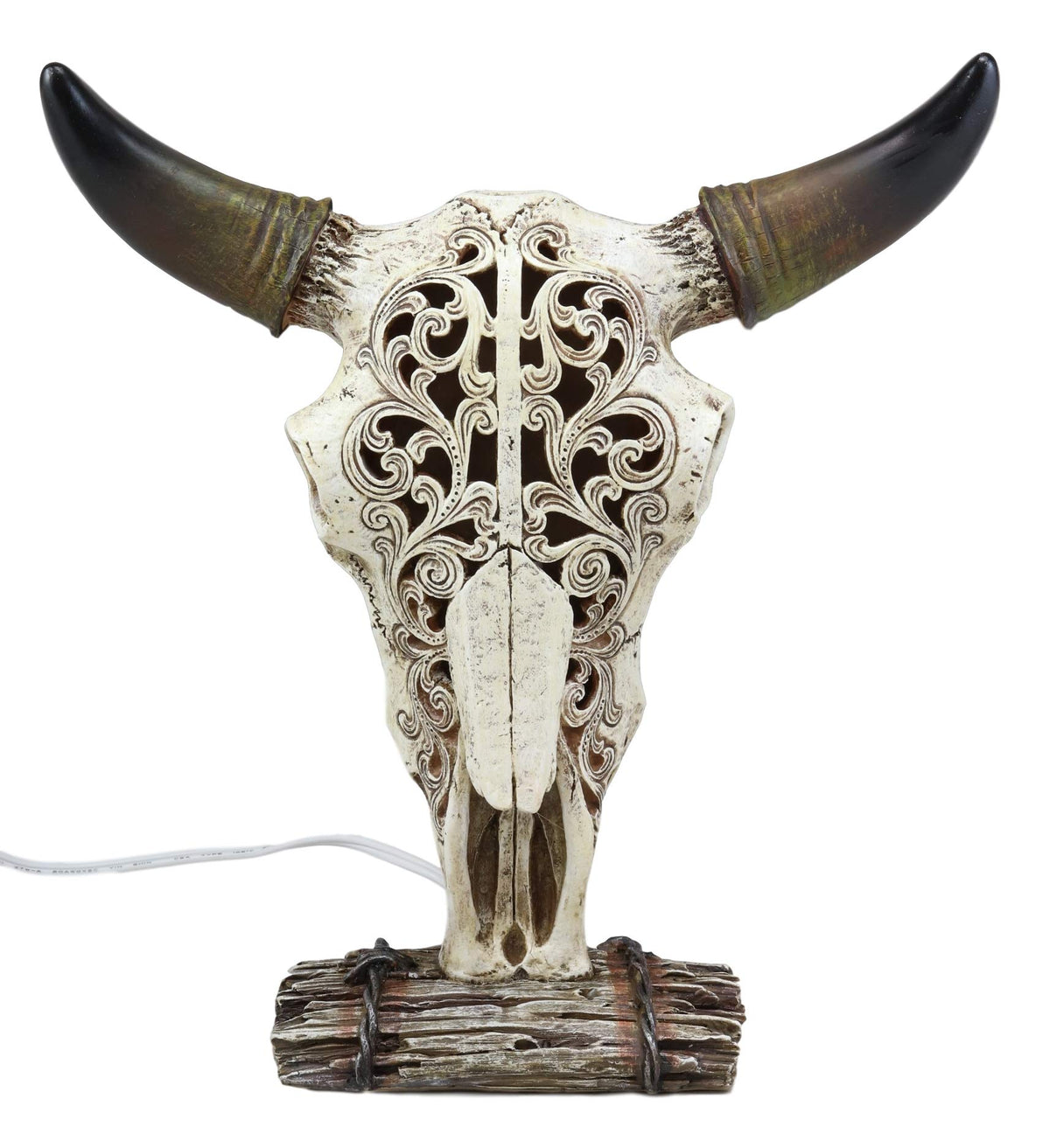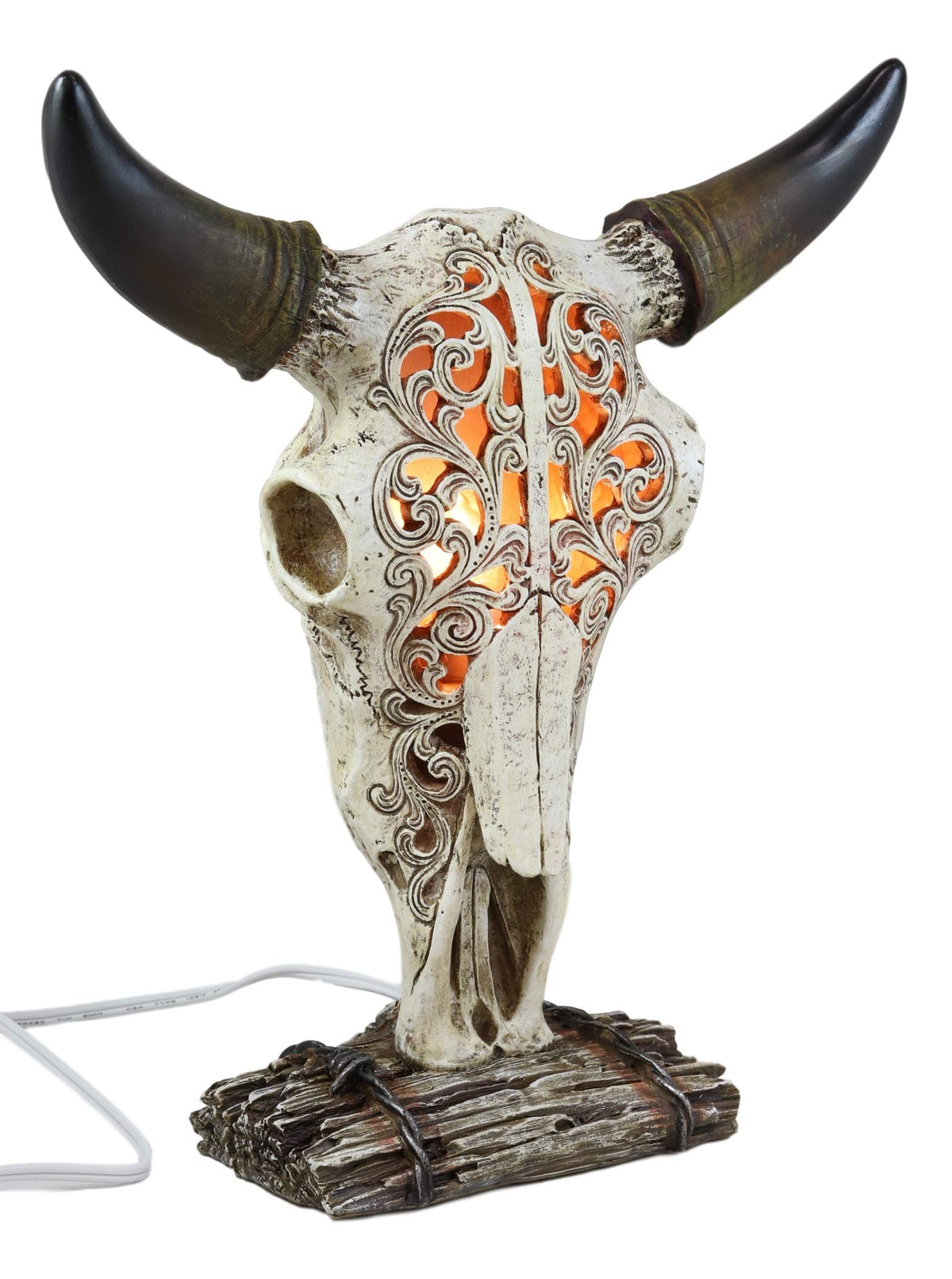 Ebros 12.5" Tall Southwest Aged Bone Tooled Filigree Lace Design Steer Bison Buffalo Bull Cow Horned Skull Head Night Light Lamp Centerpiece Side Table Decor Statue Skulls Western Accent Lighting