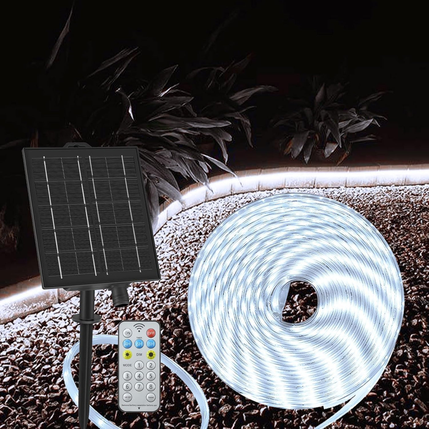 - **User-Friendly Remote Control**: Adjust settings effortlessly with the included remote, featuring 8 lighting modes, 3 timer functions, and 4 brightness levels—simply point at the solar panel to control the lights.