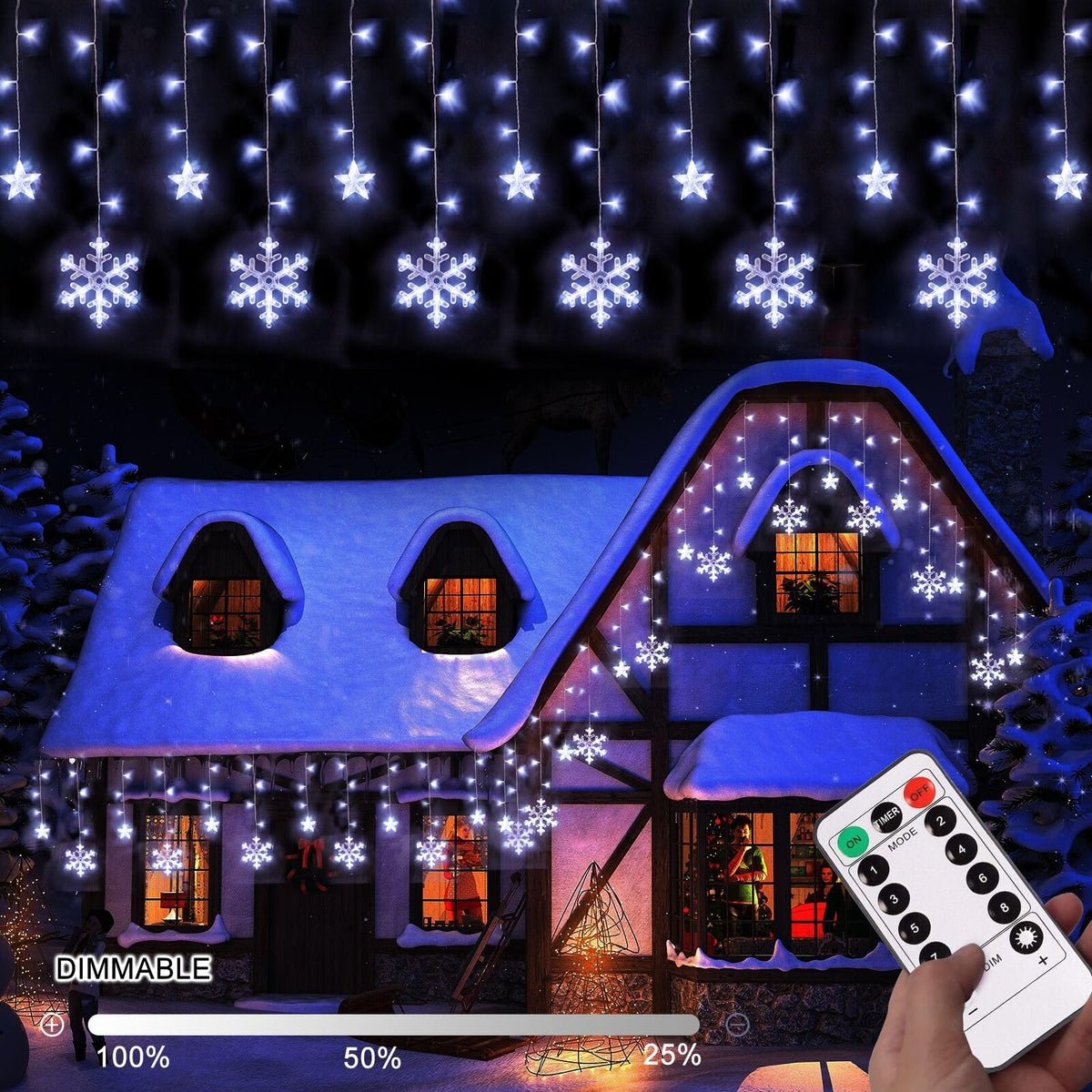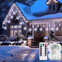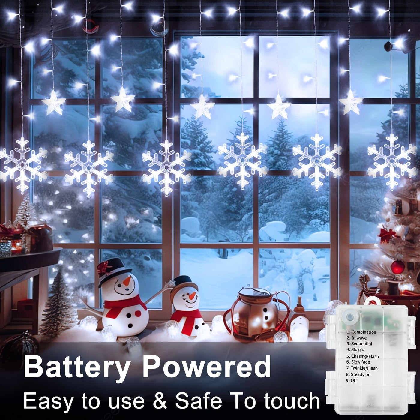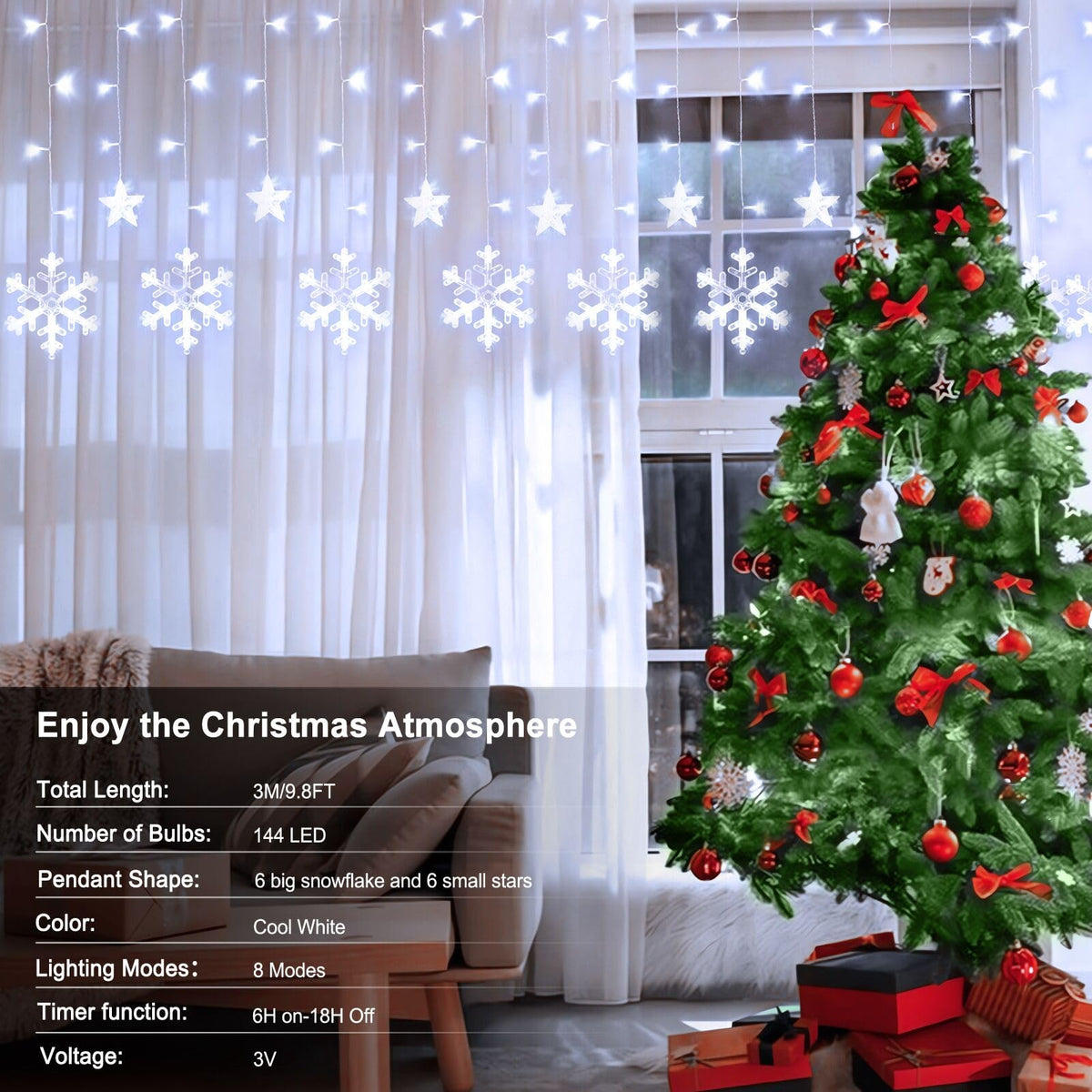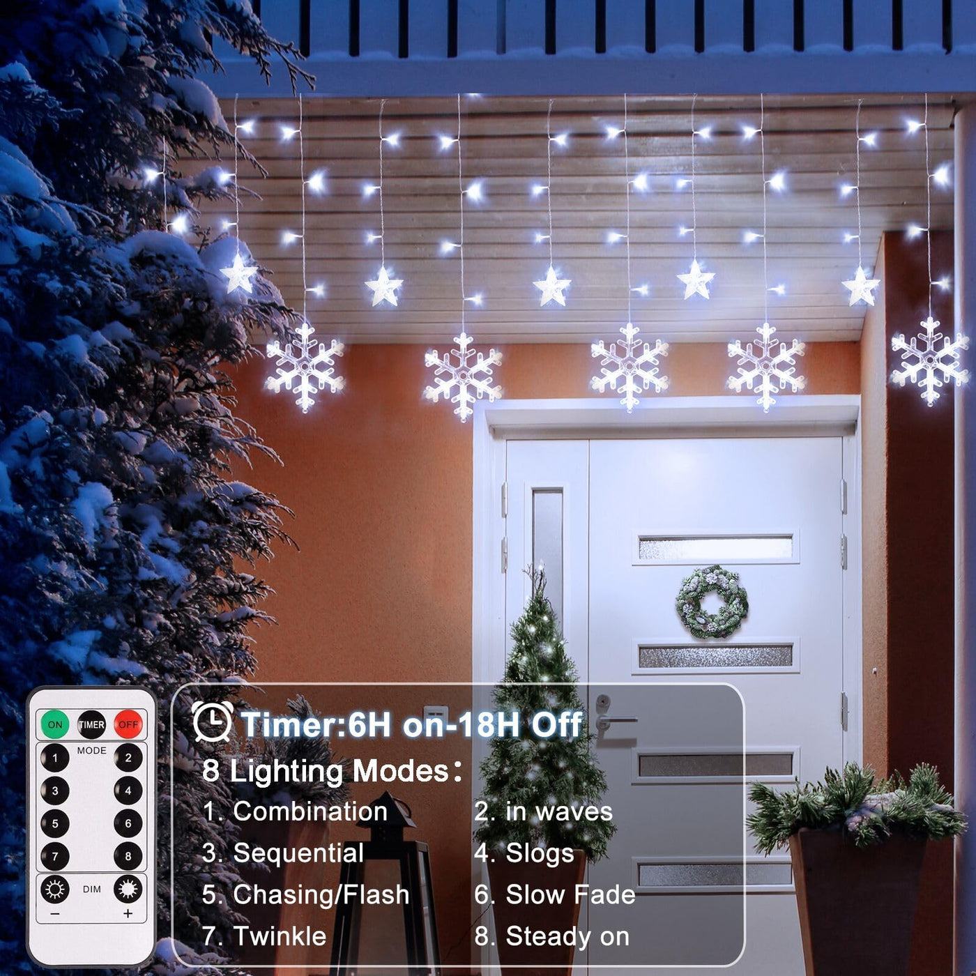 echosari Christmas Snowflake Lights Battery Powered, 9.8ft 144LED Snowflake Iciclie Lights with Remote Timer, Waterproof Snowflake String Lights for Eaves Porch Window Xmas Holiday Wedding Decor Specifications: Total Length: 9.8 FT Length of lead: 19.7 IN LED Quantity: 144 Color: Cool White Material: Plastic Power supply: Battery Powered Package Includes: 1 x 9.8 FT Snowflake Icicle Lights with Stars 1 x Remote Control 1 x Instruction Manual