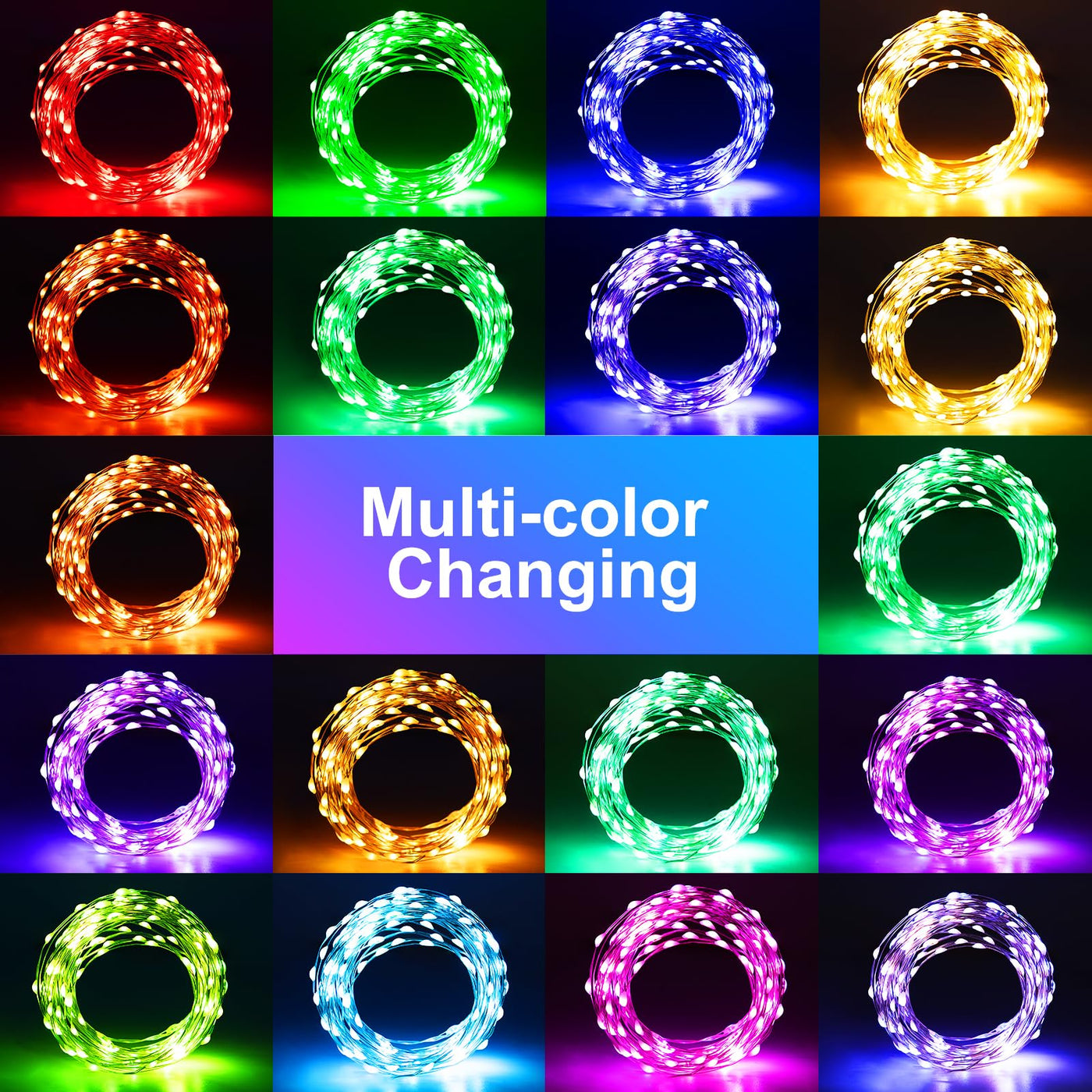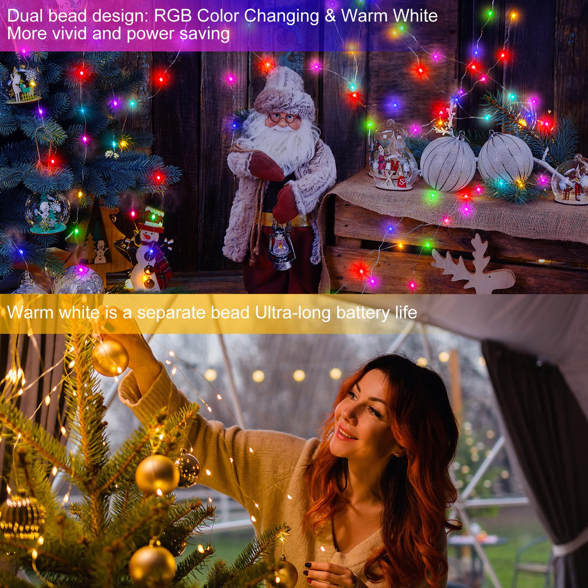 echosari Christmas Fairy Lights Battery Operated, RGB Color Changing & Warm White 33Ft 100 LED Twinkle Lights Xmas Lights Long-Lasting Battery Life for Bedroom Trees Decor Specification: Light Color: RGB Color Changing and Warm White LED Quantity: 100 String Length : 33ft Cable Color: Clear Waterproof Rate: IP44 Power Source: Battery