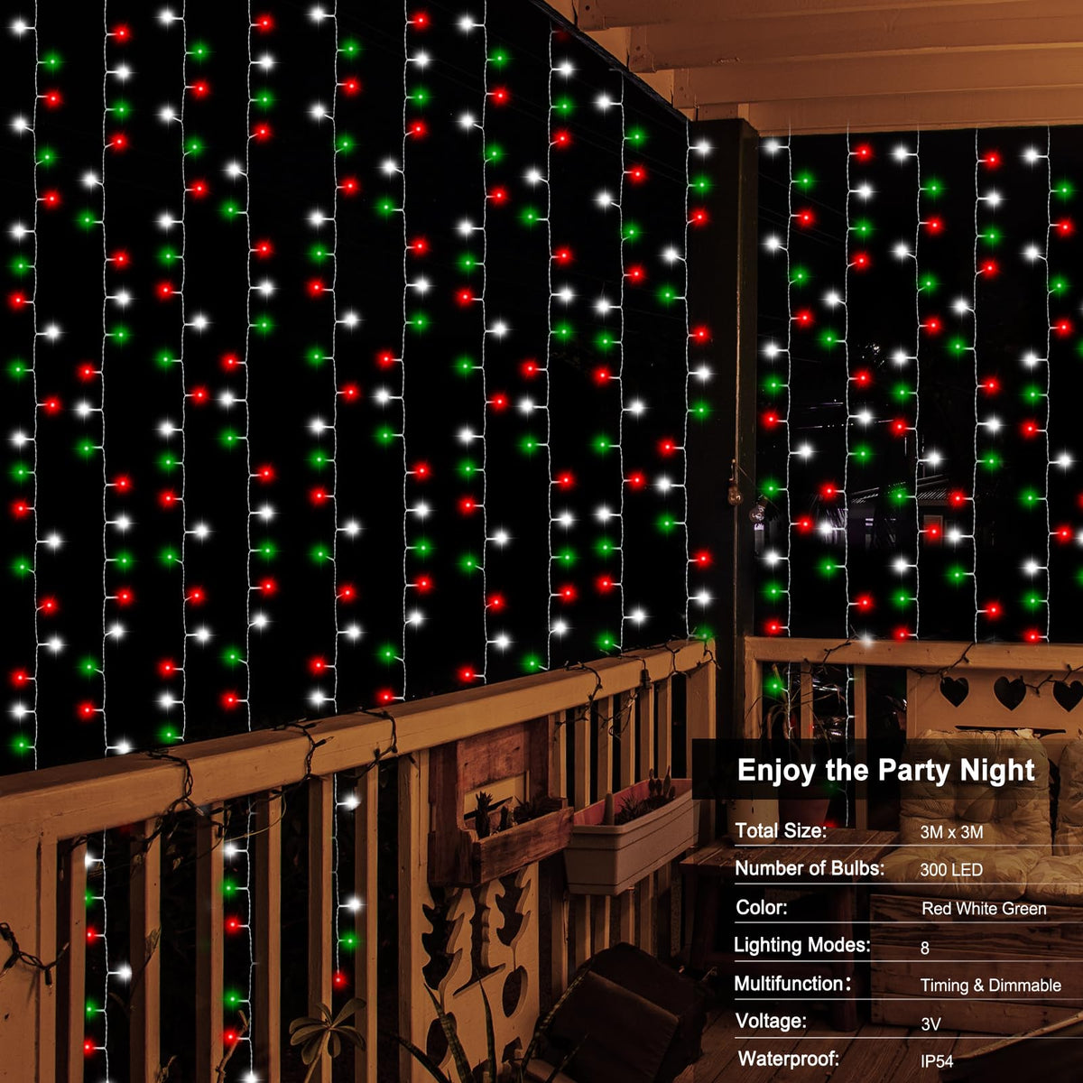 Red White Green Christmas Curtain Lights Battery Operated, 300 LED Fairy Curtain Lights 9.8Ft x 9.8Ft Hanging Lights with Remote Timer for Party Holiday Garden Yard Decor