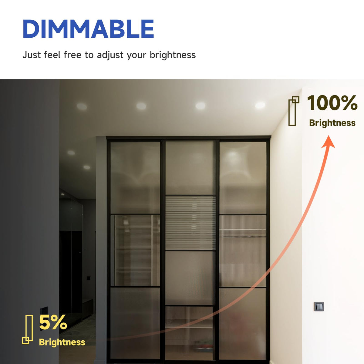 Q: Is the ECOELER recessed lighting dimmable?A: Yes, the ECOELER recessed downlight is designed for smooth dimming, allowing you to adjust the brightness from 100% to 5%, making it compatible with most dimmers on the market.