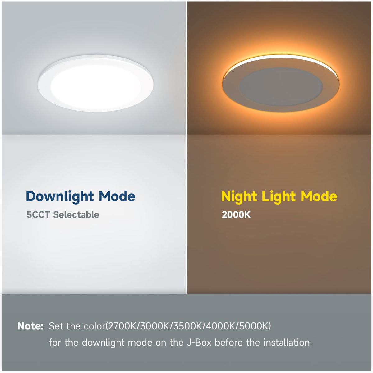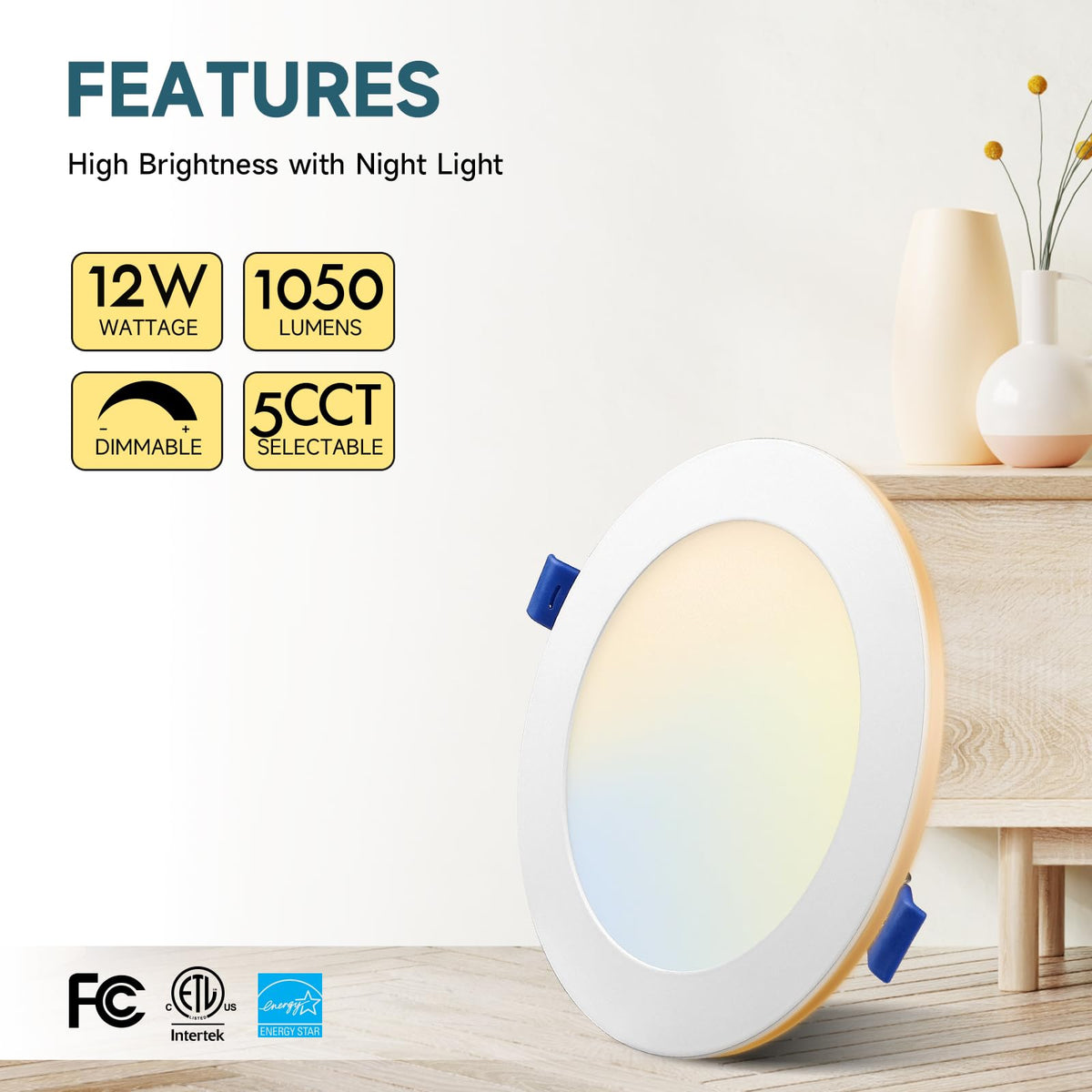 Ecoeler 6 Inch 5Cct Led Recessed Ceiling Light With Night Light, 2700K/3000K/3500K/4000K/5000K Selectable Canless Recessed Light