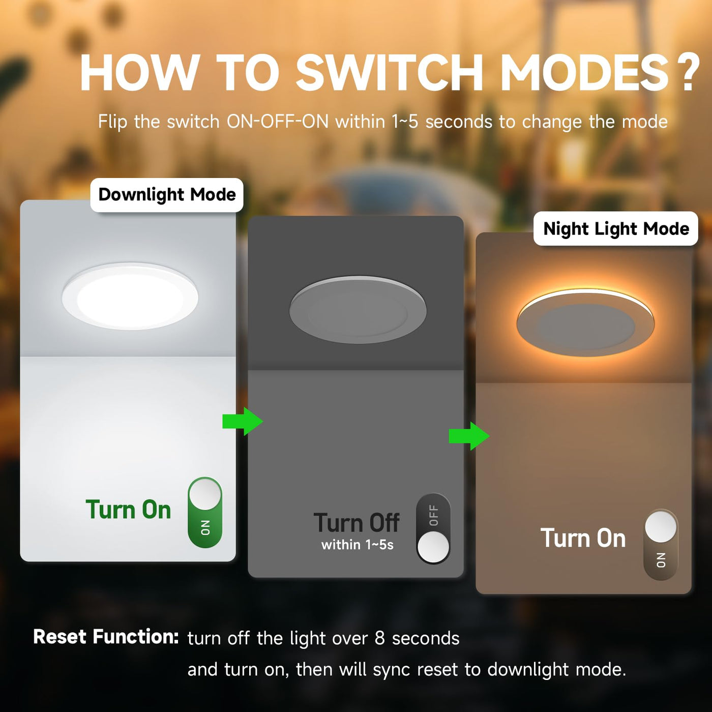 Q: How does the night light mode work on the ECOELER recessed lighting?A: The ECOELER recessed lighting has a dual mode feature. You can switch between night light mode and downlight mode easily by turning the light off and on within 2 seconds. The night light mode emits a 2000K amber light, creating a warm and soft ambiance for comfort in dark areas.