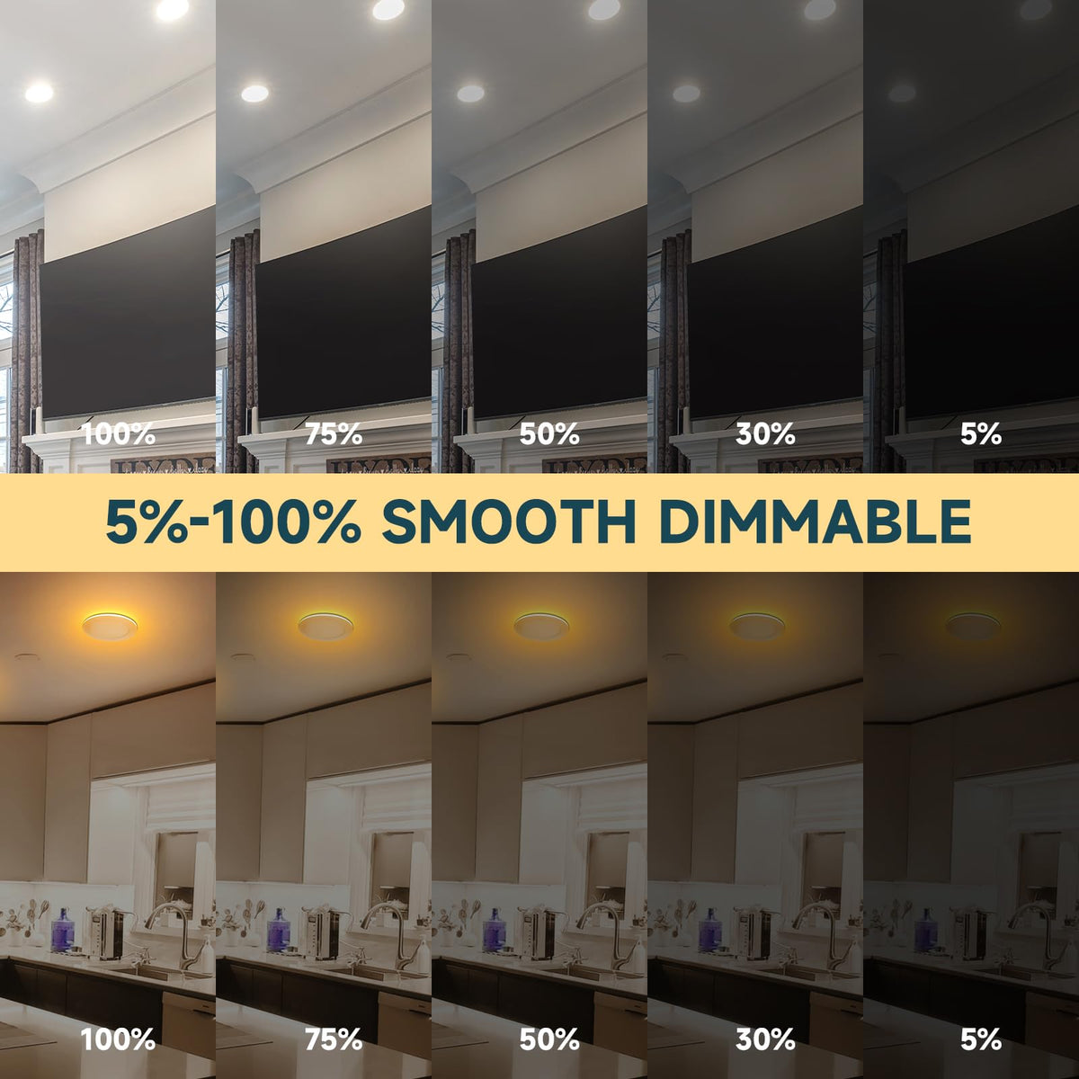 Q: Can I dim the ECOELER LED recessed ceiling lights?A: Yes, both night light mode and downlight mode support seamless dimming from 100% to 5%. This feature allows you to adjust the brightness to fit your mood or decor without any flickering, flashing, or humming noise.