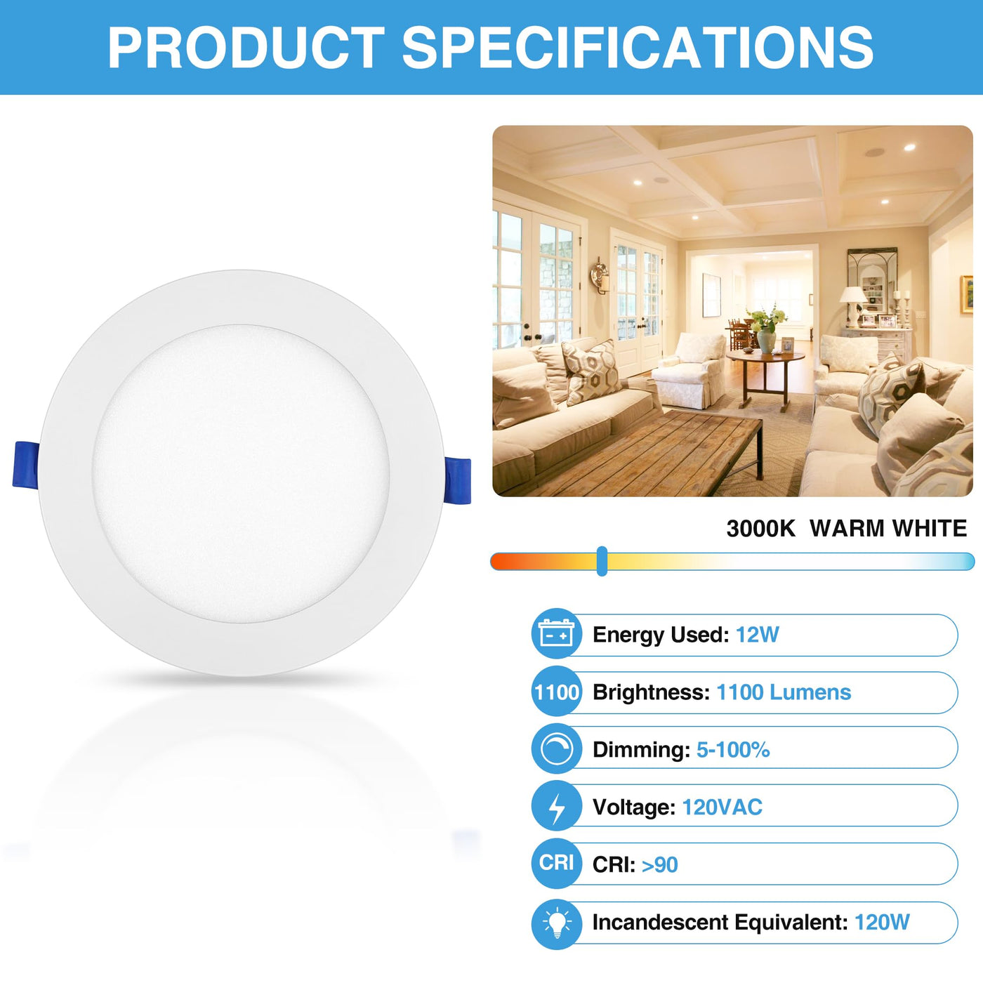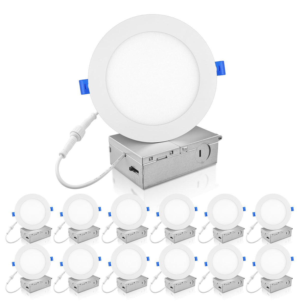 Q: What are the key features of the ECOELER 6 Inch LED Recessed Ceiling Lights?A: The ECOELER 6 Inch LED Recessed Ceiling Lights feature high brightness with 1100 lumens while consuming only 12 watts, making them energy-efficient. They are IC rated, ensuring safety against overheating, and can smoothly dim from 100% to 5% for customizable ambiance. Installation is easy due to their low-profile design, and they come with a junction box for quick setup.