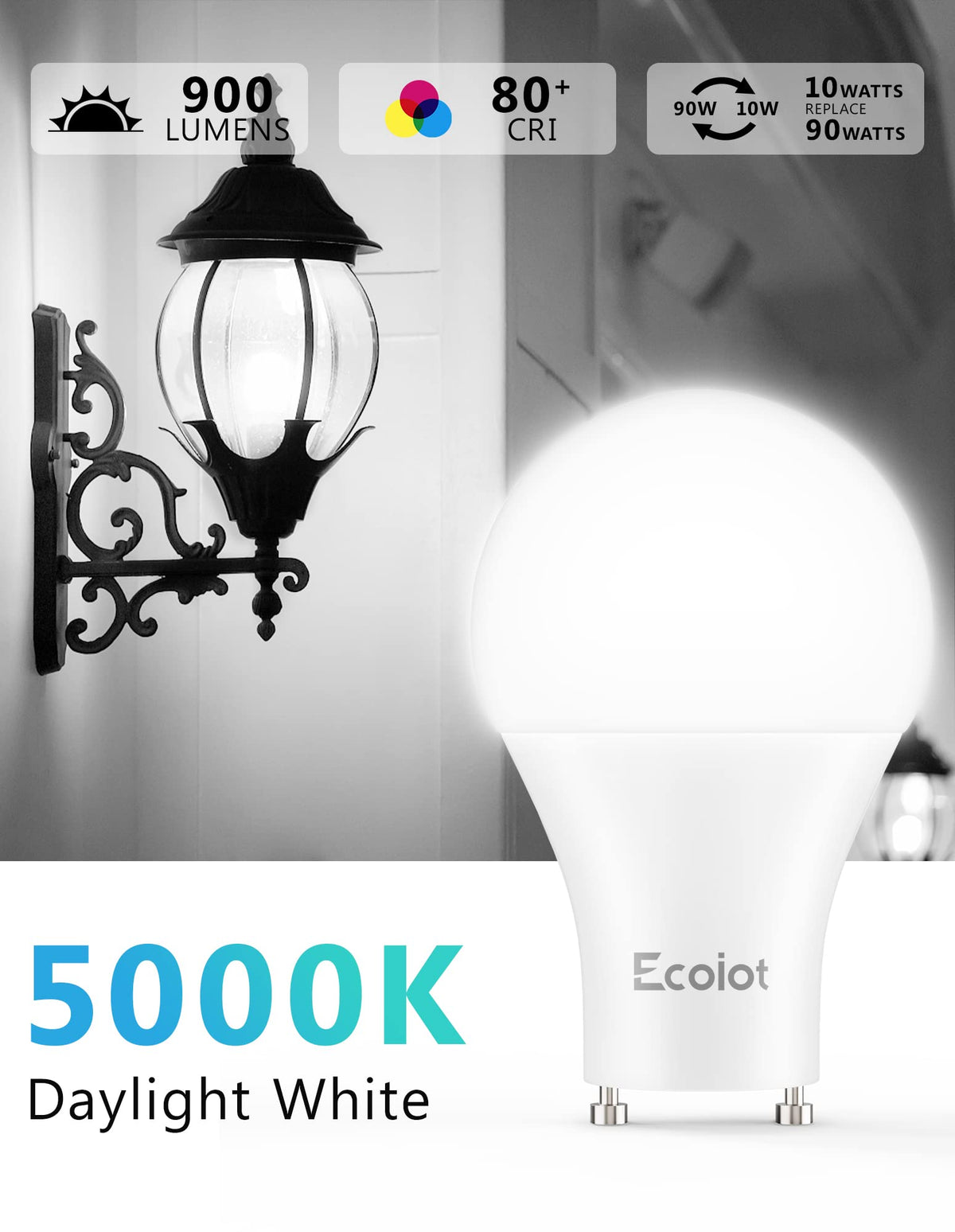 ECOIOT GU24 Dusk to Dawn Light Bulbs, Sensor LED Light Bulbs, A19 10W (90Watt Equivalent), Photocell Sensor, Automatic On/Off for Indoor/Outdoor Lighting (5000K Daylight), GU24 Base, 900LM, 4 Pack
