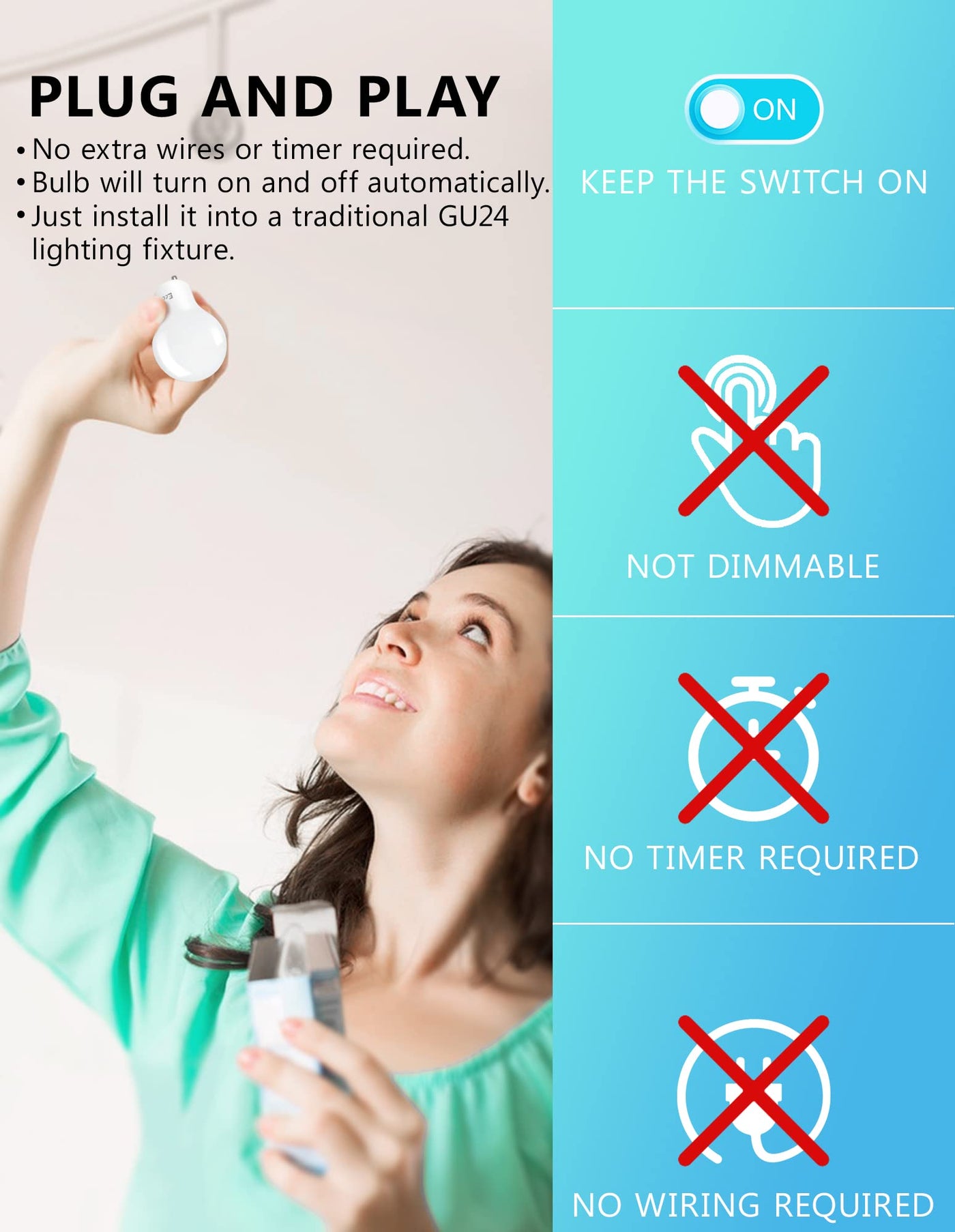 Q: How do Ecoiot GU24 Dusk to Dawn Outdoor Light Bulbs work?A: The Ecoiot GU24 Dusk to Dawn Outdoor Light Bulbs feature a built-in light sensor that automatically detects ambient light levels. They turn on at night when it's dark and turn off during the day when there is sufficient light, providing hassle-free lighting for your home.