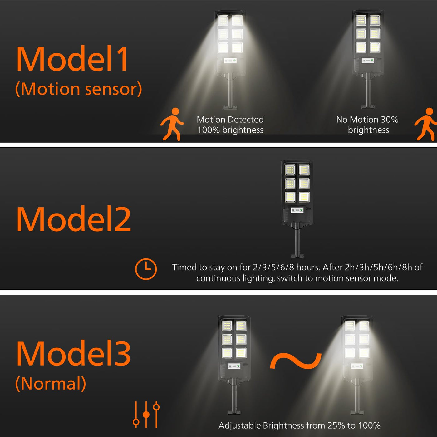 Q: What lighting modes do the EcoJLigOas solar lights offer?A: These solar lights come equipped with a wireless remote control and feature three lighting modes: Motion Sensor Mode, Timed Mode (with options for 2/3/5/6/8 hours), and Normal Mode with adjustable brightness from 25% to 100%.