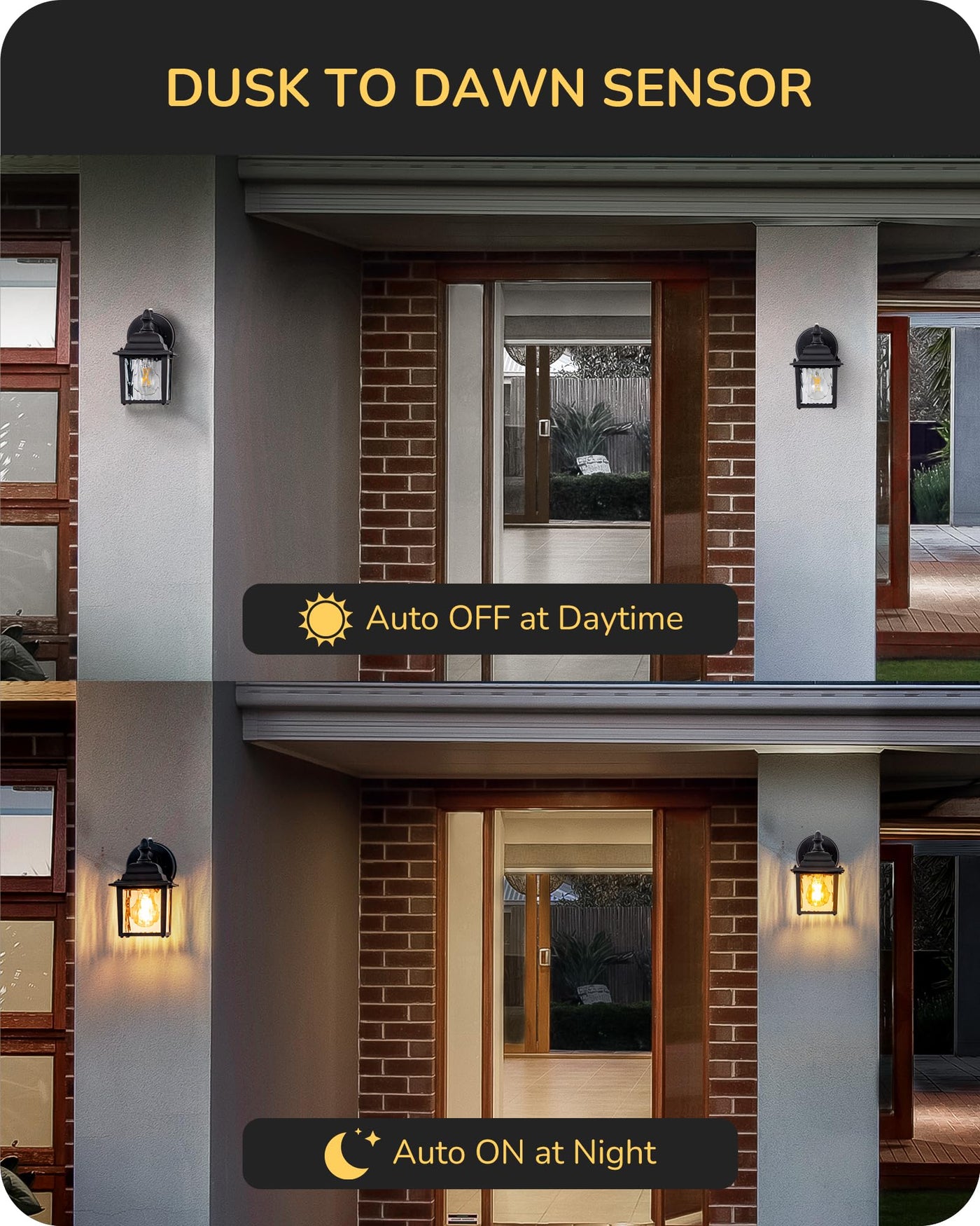 The EDISHINE 2 Pack Outdoor Wall Lights combine smart convenience with timeless style. Featuring a built-in dusk-to-dawn sensor, these exterior lights automatically turn on at night and off during the day-no need to flip a switch! The clear water ripple glass casts a charming glow while adding texture and character, and the black anti-rust finish ensures long-lasting beauty in any weather. Waterproof and durable, these modern wall sconces are perfect for your front door, garage, patio, or porch-bringing both safety and style to your homes exterior! Specifications: -Input Voltage: 120VAC 60HZ -Max load Power for Bulb: Incandescent Bulb 60W( bulb not included) -Socket Type: Standard medium E26 -Material: Aluminum+glass Packing List: - Wall Light x2 - Wire Connectors x6 - Mounting Screw x4 - Instruction Manual x1
