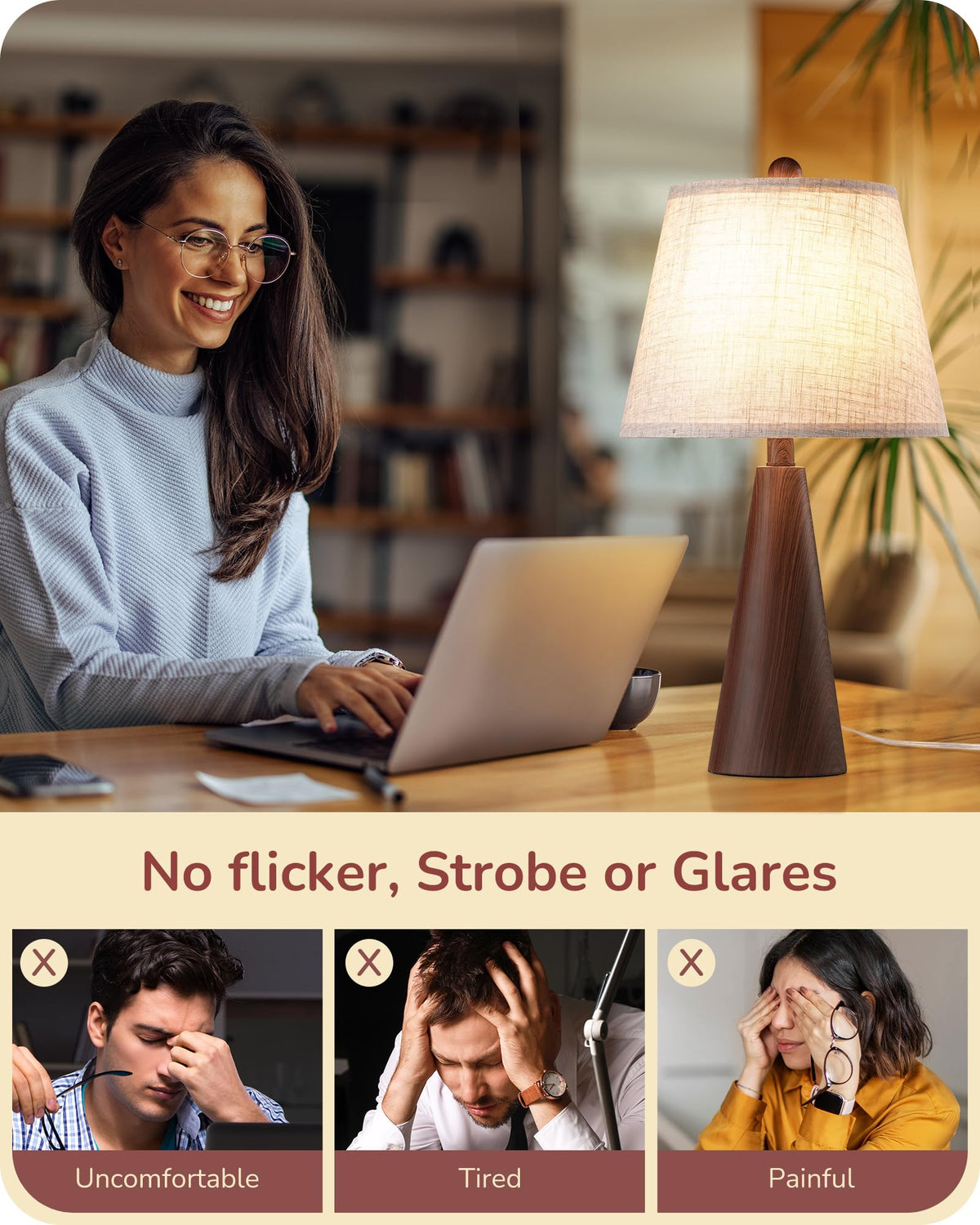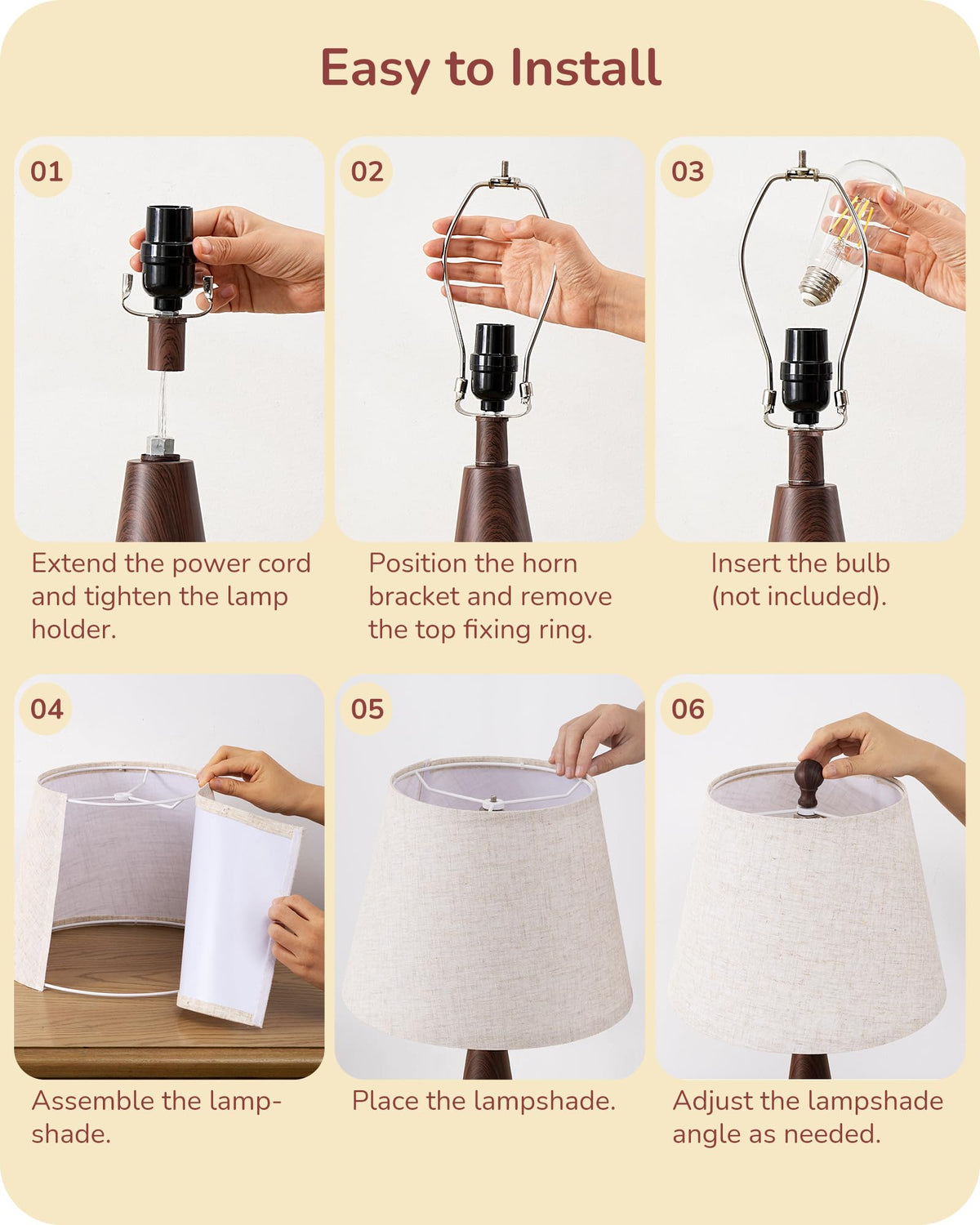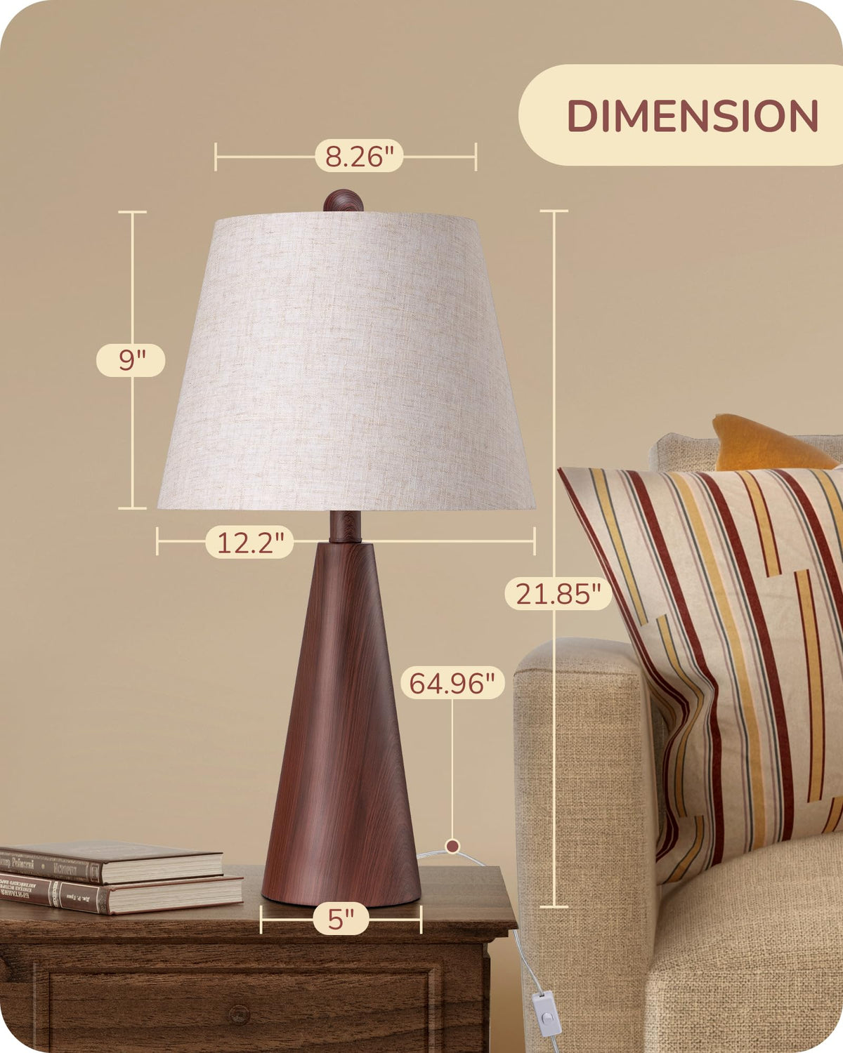 The EDISHINE 21.85 Farmhouse Table Lamp brings a perfect blend of rustic warmth and modern elegance to your space. Featuring a water transfer wood grain metal base, it mimics the natural beauty of wood while ensuring durability. The soft beige linen shade diffuses light beautifully, creating a warm and inviting ambiance-ideal for cozy nights in the bedroom, relaxed evenings in the living room, or focused work sessions in the office. Designed with an E26 base, this lamp offers versatile bulb compatibility, allowing you to customize your lighting to suit any mood. Simple yet stylish, its the perfect touch of farmhouse charm for any home! Specifications: - Product Height: 21.85 IN - Base Diameter: 5.1 IN - Wire Length: 65IN - Materials: Metal, Linen - Input Voltage: 120VAC 60Hz - Max.Load Power: Incandescent Bulb 60W or LED Bulb 12W - Socket Type: Standard Medium E26 Packing List: - 1 x Table Lamp - 1 x Lamp Shade - 1 x Lampshade Bracket - 1 x User Manual