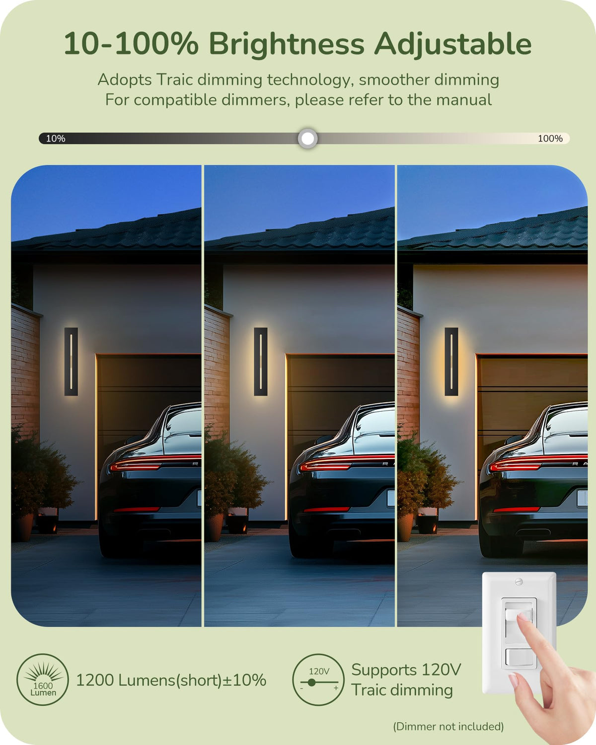 The EDISHINE 2 Pack 23.6 Outdoor Wall Lights offer a sleek, modern design perfect for any exterior space. Featuring dimmable LED lights with 3 CCT options, these fixtures provide customizable lighting to suit your needs. Made of durable iron and acrylic, they are waterproof and designed to withstand the elements. Ideal for garages, patios, or outdoor walls, these 120V, 16W sconces feature a powder-coated black finish for added durability and style. Specifications - Dimensions: 23.6 (L) - Material: Iron & Acrylic - Wattage: 16W per fixture - Voltage: 120V Packing List - 2 x Outdoor Wall Lights - 2 x Mounting Brackets - 1 x User Manual