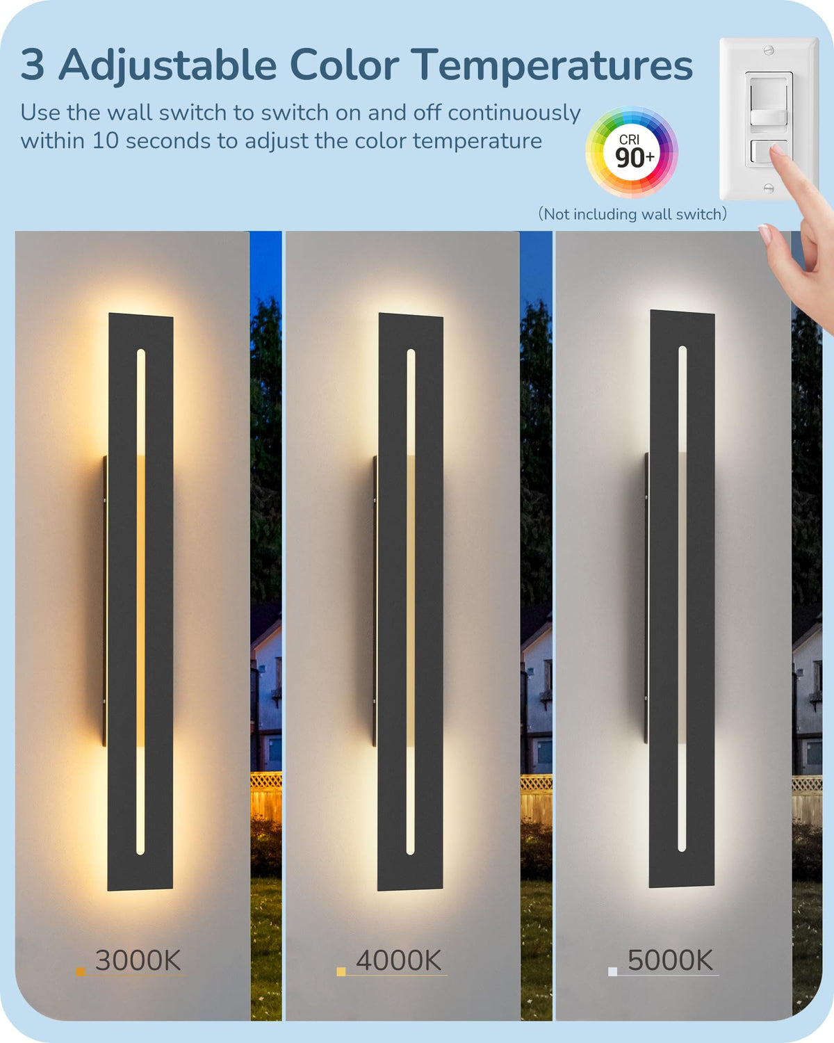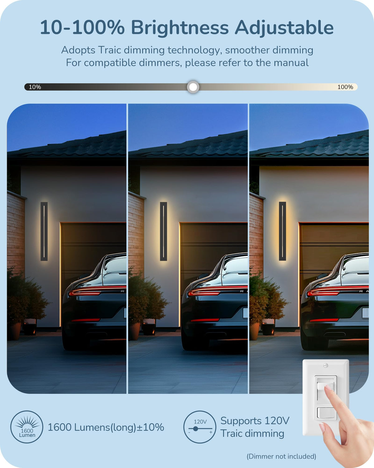 The EDISHINE 2-Pack 39.3 Outdoor Wall Sconce offers modern, dimmable lighting for your exterior spaces. Made from durable iron and acrylic, these wall lights feature 3 CCT settings (3000K/4000K/5000K) for customizable lighting. With a waterproof design, theyre perfect for the front door, hallway, or any outdoor area. The 120V, lights are black-painted for a sleek, contemporary look, ensuring long-lasting performance. Ideal for adding style and functionality to your homes exterior. Specifications - Dimensions: 39.3 (L) - Material: Iron & Acrylic - Voltage: 120V Packing List - 2 x Outdoor Wall Lights - 2 x Mounting Brackets - 1 x User Manual