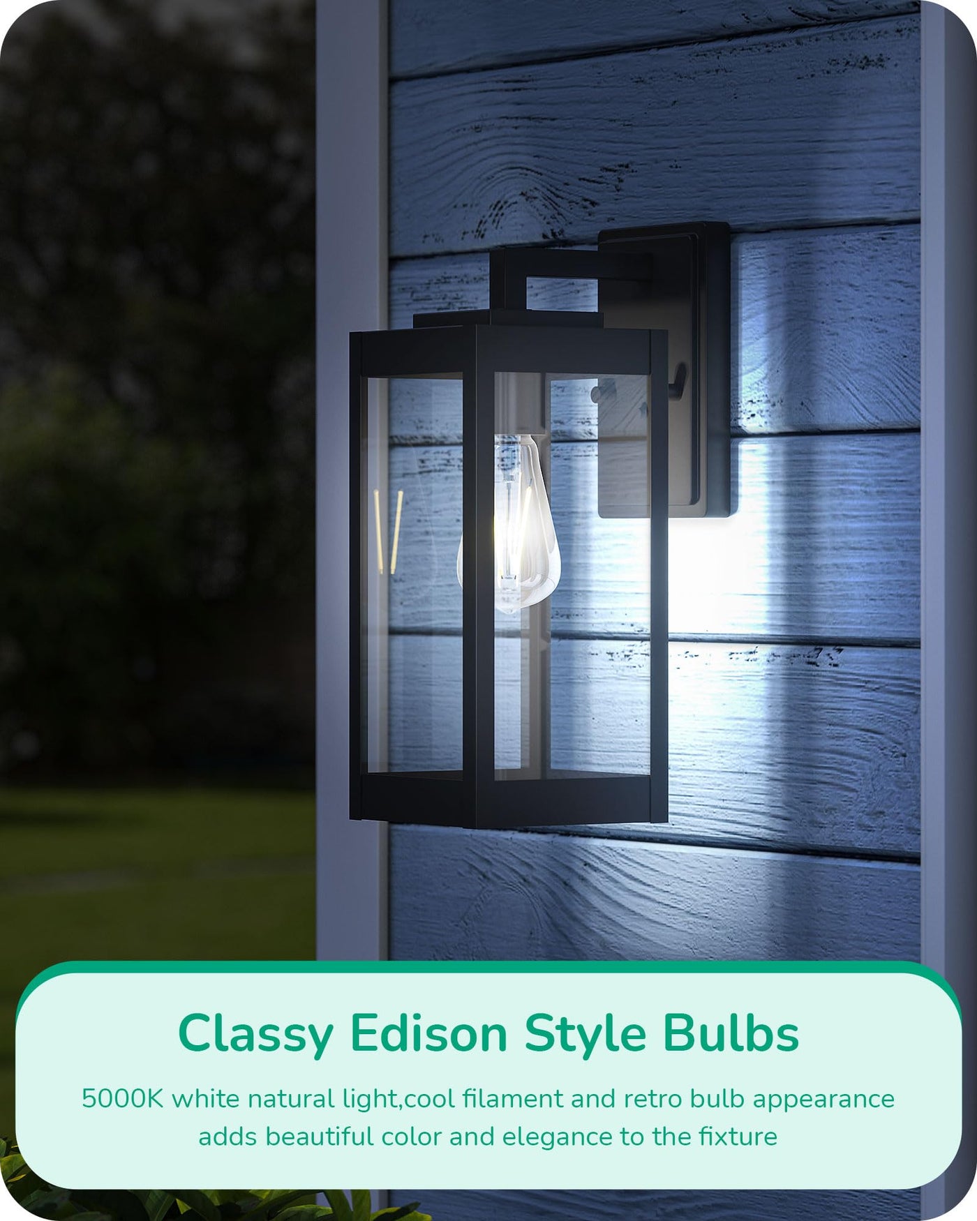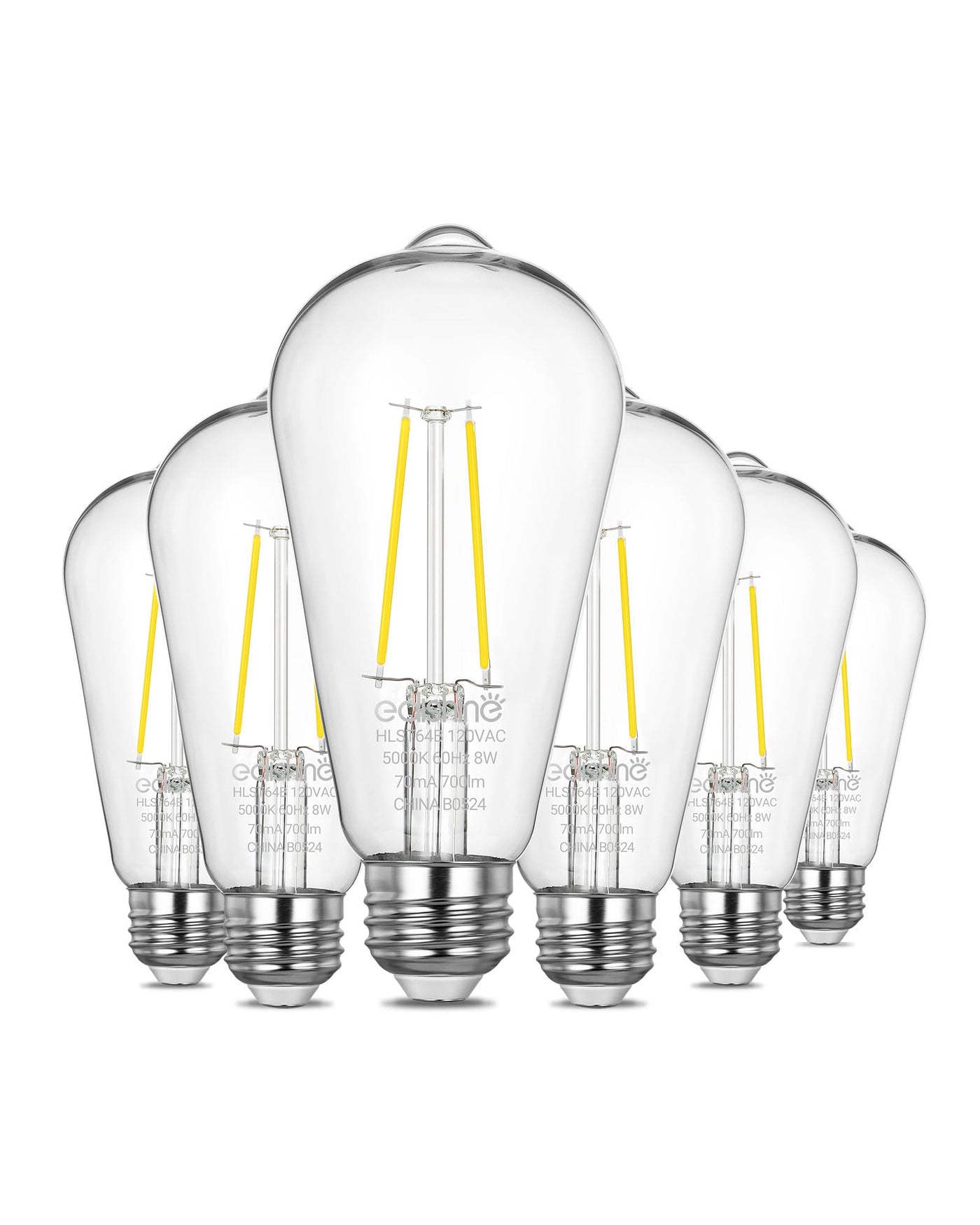 EDISHINE 6 Pack 700LM Outdoor Dusk to Dawn LED Light Bulb with 240 Beam Angle & E26 Base, 8W Equivalent 60W Dusk to Dawn lights make your outdoor area safer and give you bright light without any hassle. Our bulbs turn on at sunset and turn off when it gets light again. Simply turn it on, and the built-in sensor will take care of everything. You dont need to worry about setting a timer. These special light bulbs have a modern LED filament inside that gives a vintage look to any area. The ST64 LED Filament Bulb with Dusk to Dawn is safe to use outside, even in wet conditions. You can use it in lanterns or wall sconces on your outside walls or porch, in hanging lights for your outdoor dining spaces, or in retro-style fixtures like gooseneck barn lights. They also work well with string lights that have an E26 base.