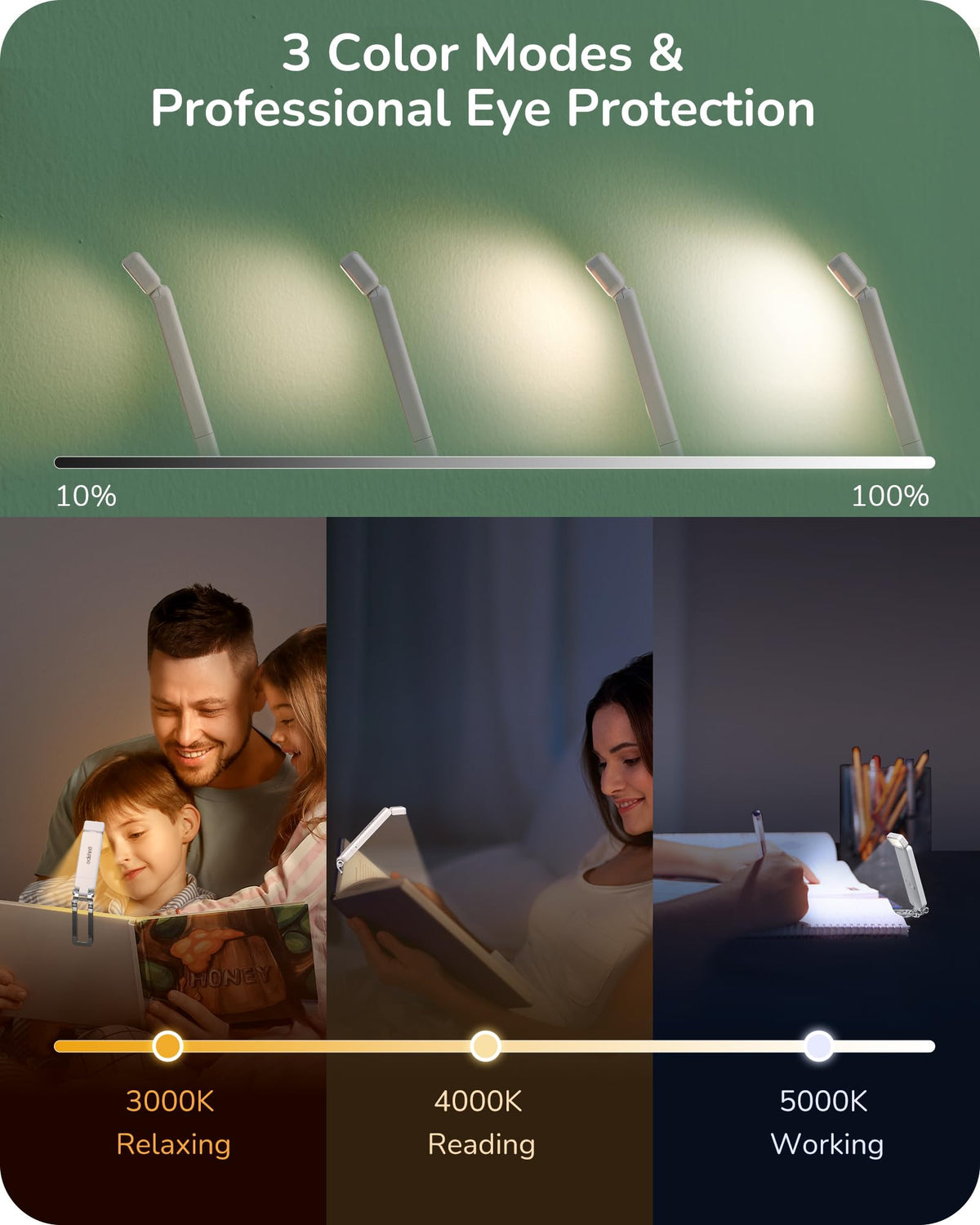 EDISHINE Night LED Bookmark Lamp with USB Rechargeable Choose between Warm (3000K), Natural (4000K), and Cool White (5000K), depending on your reading environment. 10%-100% stepless dimming, allowing you to adjust brightness level freely. With clip-on design, attached to books, e-readers, or any other reading material, ensuring a secure grip. No need for frequent recharging, long battery life, up to 70hrs (dimmest setting).