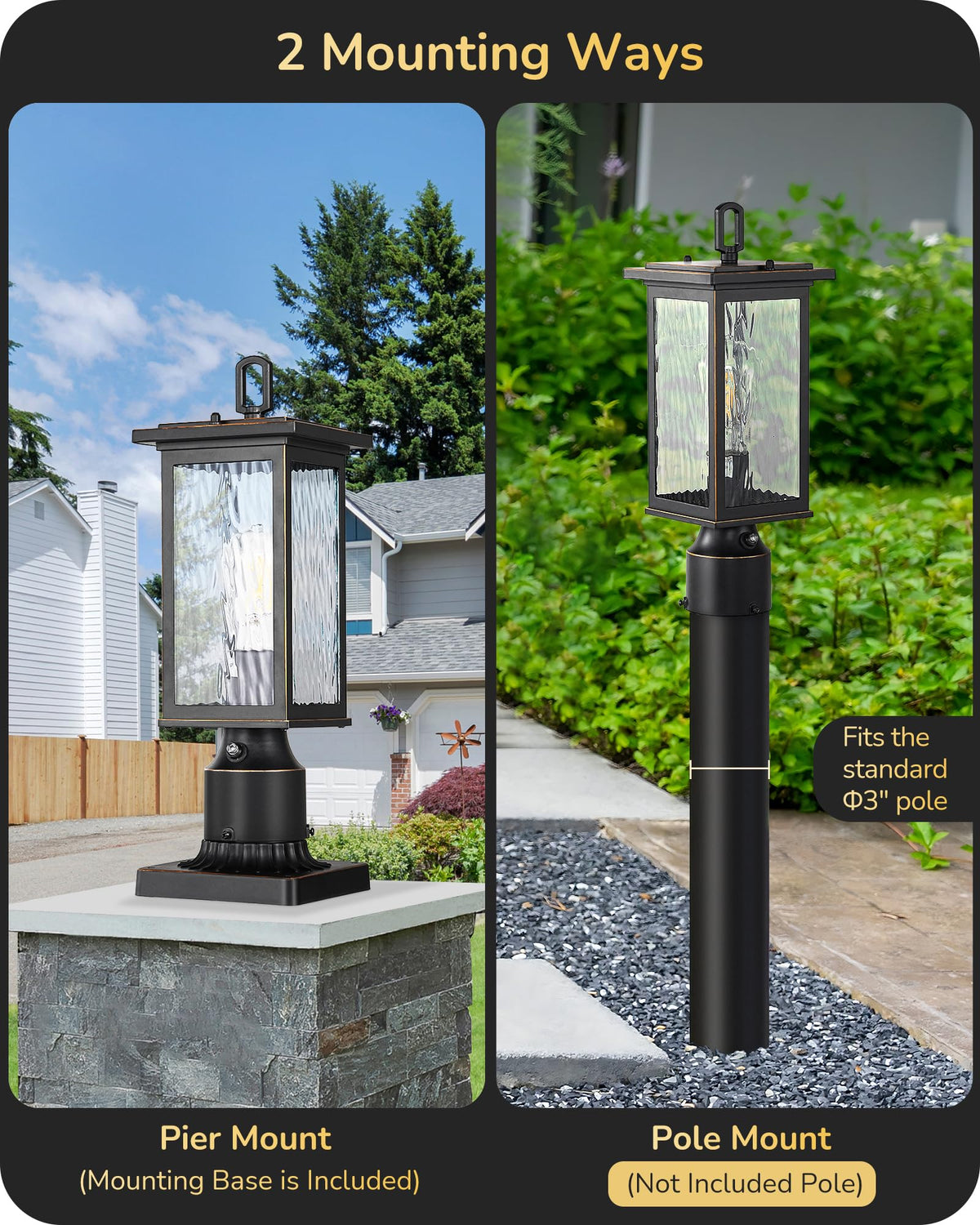 EDISHINE Dusk to Dawn Outdoor Post Light with Water Ripple Glass & Aluminum Post Lantern HeadDesigned to seamlessly integrate into your outdoor space, this lantern head features a pole light fixture with a pier mount base. Whether lining your driveway, accentuating your garden path, or illuminating your patio, this versatile fixture adds a touch of sophistication to any setting.Equipped with dusk to dawn functionality, this outdoor post light automatically turns on at dusk and off at dawn, providing convenience and energy efficiency. Plus, compatibility with E26 base bulbs (up to 60W) allows you to customize your lighting to suit your preferences, whether you prefer LED, incandescent, CFL, or halogen bulbs (bulbs not included).Specifications:- Input Voltage: 120VAC 60HZ - Max load Power for Bulb : Incandescent Bulb 60W( bulb not included) - Socket Type: Standard medium E26- Material: Die-casting Aluminum and Glass- Function : Dusk to Dawn SensorPacking List:-Post light x1-Pier mount base x1-Wire connectors x3-Mounting screw x4-Expansion bolt x4-Instruction manual x1