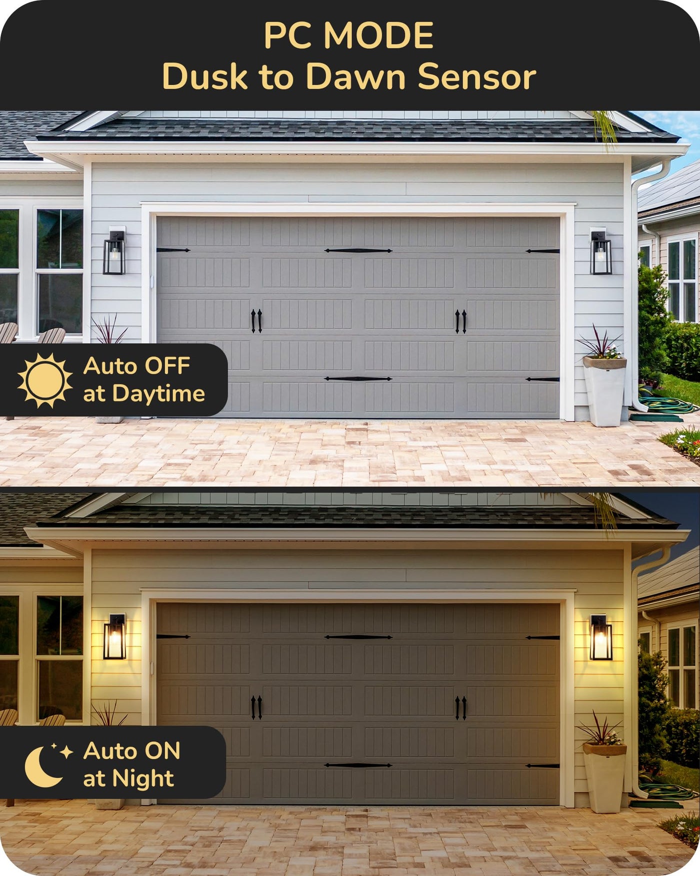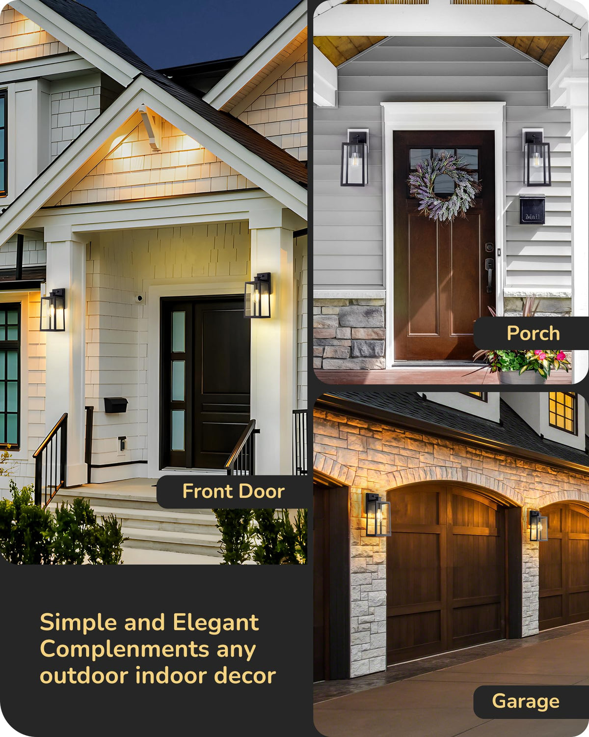 EDISHINE 2 Pack Dusk to Dawn Outdoor Wall Lights with 3 Modes & Clear Glass The EDISHINE Dusk to Dawn Outdoor Wall Lights are perfect for your front door, garage, patio, and more. This 2-pack set includes modern black wall lanterns with clear glass and offers: -Dusk to Dawn Sensor: Lights automatically turn on at dusk and off at dawn. -3 Modes: Auto, Manual, and Timer settings. Modern Design: Stylish and sleek look for any outdoor space. -Durable Construction: Built to withstand all weather conditions. -Easy Installation: Quick and simple setup with included hardware. Specifications: -Input Voltage: 120VAC 60HZ -Max load Power for Bulb : Incandescent Bulb 60W( bulb not included) -Socket Type: Standard medium E26 -Material: Aluminum+glass -Product size: (H)13.42 (W)5.82 (D)6.3inch -Function : Dusk to Dawn Sensor Packing List: - Wall Light x2 - Wire Nuts x6 -Outlet Screw x4 -Mounting Bracket x2 -Instruction Manual x1
